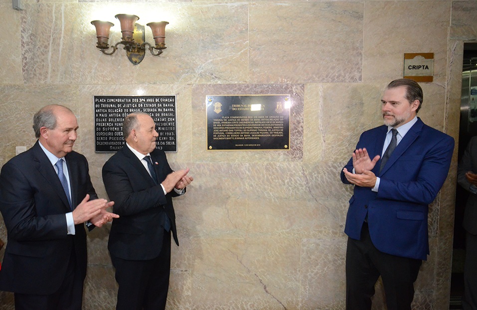 Antes de palestrar, o ministro Dias Toffoli descerrou, com o presidente do TJBA, desembargador Gesivaldo Britto, e com o presidente do Supremo Tribunal de Justiça de Portugal, desembargador Antonio Joaquim Piçarra, placa de comemoração aos 410 anos do TJBA na cripta do jurista Rui Barbosa.