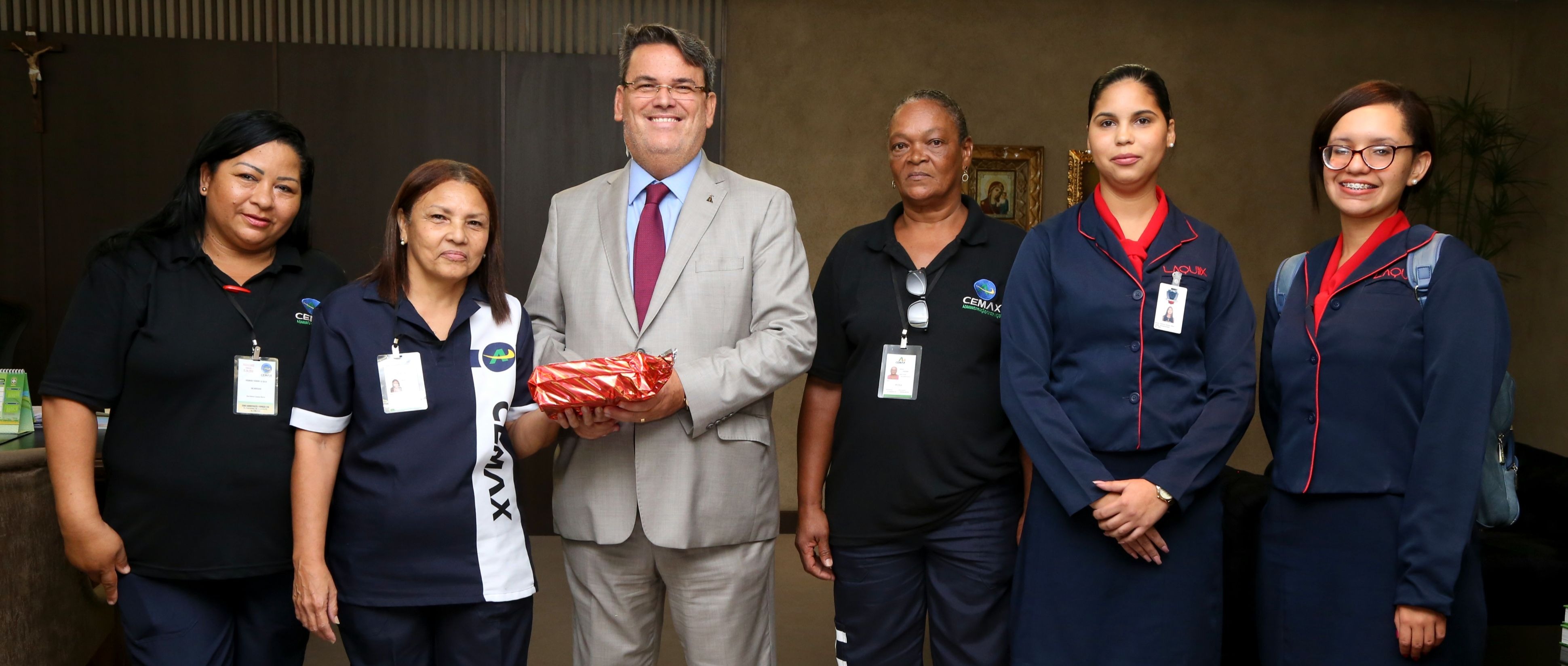 O presidente do Tribunal de Justiça do Estado do Rio de Janeiro, desembargador Claudio de Mello Tavares, recebeu hoje (10/4), dia do seu aniversário, um presente muito especial: uma comissão de funcionários terceirizados – Maria da Graça da Silva Gomes, Rosineide Ferreira da Silva e Rosa Maria Ferreira Fernandes, que trabalham na limpeza; e as recepcionistas Sandra Regina da Silva Almeida Vasconcelos e Patricia Gomes Silva - foi ao gabinete parabenizá-lo e agradecer pela iniciativa inédita de mandar pagar, em meados de março, os salários de cerca de 1.300 servidores diretamente na conta de cada um sem que a verba fosse entregue à empresa responsável.