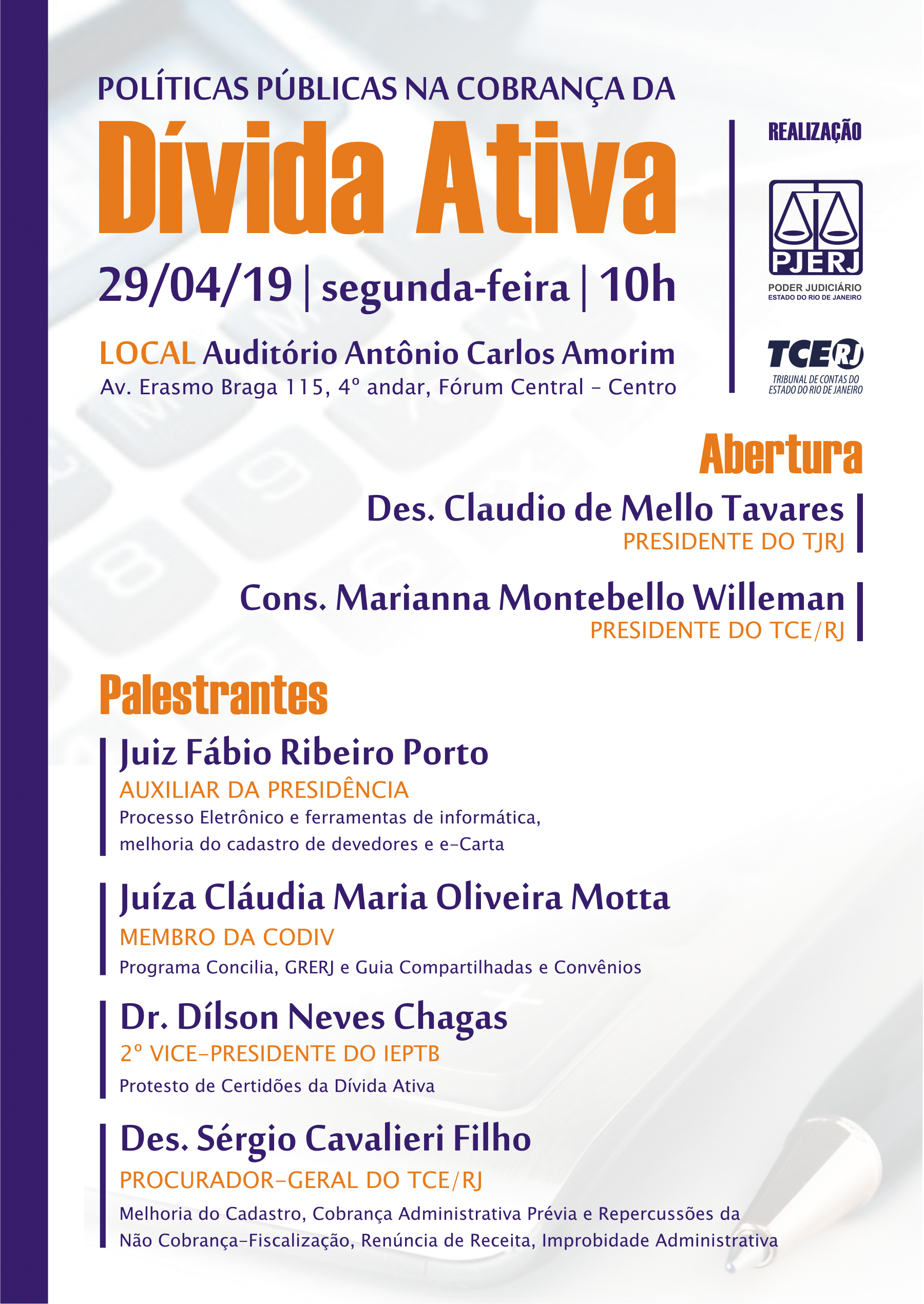 Os presidentes do TJRJ, desembargador Claudio de Mello Tavares, e do TCE, conselheira Mariana Montebello Willeman, abrirão o evento. Em seguida, o juiz auxiliar da Presidência Fábio Ribeiro Porto falará sobre “Processo eletrônico e ferramentas de informática, melhoria do cadastro de devedores e e-Carta”. A juíza Cláudia Maria Oliveira Motta discorrerá sobre “Programa Concilia, GRERJ, Guia Compartilhada e Convênios”. Caberá a um representante do IEPTB falar sobre “Protesto de Certidões da Dívida Ativa”. O desembargador Sérgio Cavalieri Filho encerrará o evento após discorrer sobre “Melhoria do cadastro, Cobrança Administrativa Prévia e Repercussões da Não Cobrança - Fiscalização, Renúncia de Receita e Improbidade Administrativa.”
