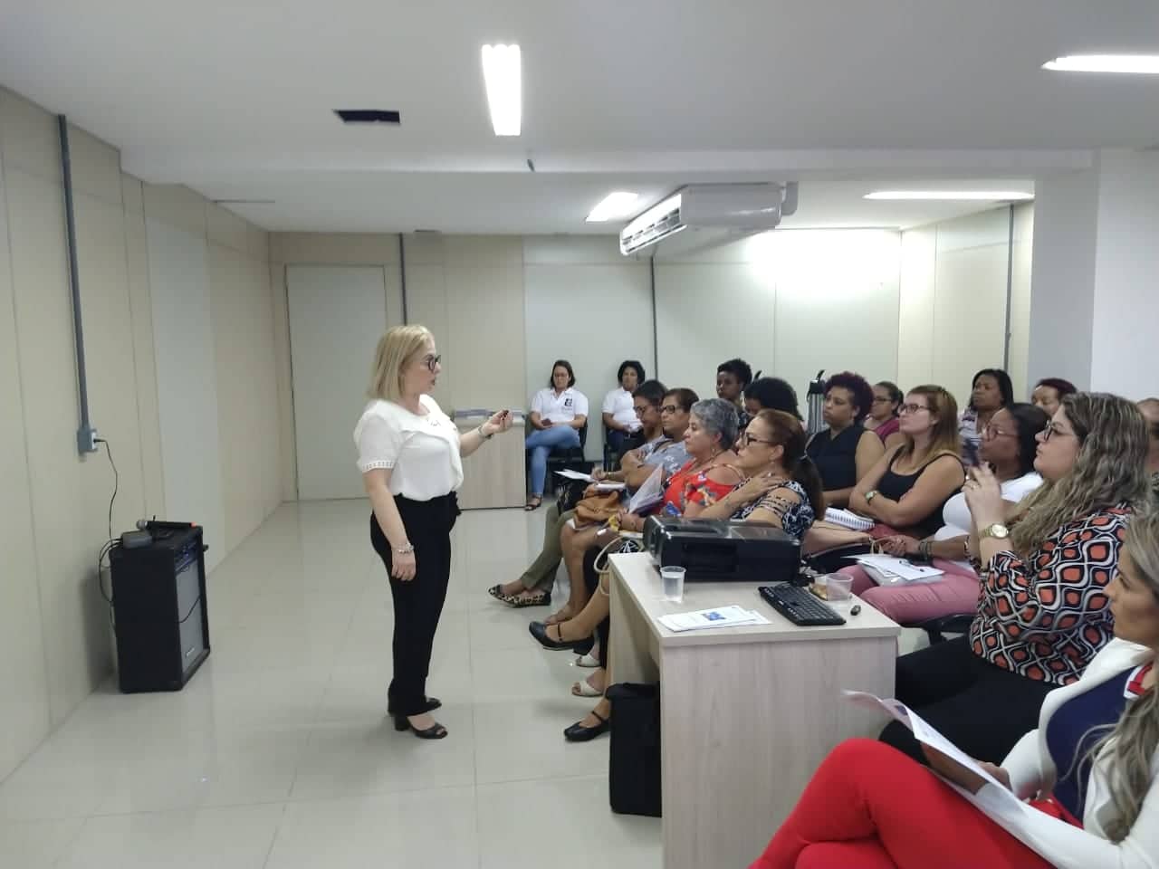 Realizado em duas etapas, o projeto conta com o trabalho de profissionais do Deape e aborda temas como a violência, adolescência e bullying, entre outros. Na última terça-feira (2/7), aconteceu a primeira etapa, na Escola de Governo da Prefeitura de Nova Iguaçu. Das 9h às 17h, as psicólogas do Deape Márcia Fayad (blusa branca ao centro) e Amanda Rangel deram palestras e desenvolveram dinâmicas com o tema “ A paz é a gente que faz, a paz começa comigo” para serem apresentadas nas escolas.