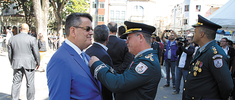 Os presidentes dos Poderes Judiciário, Executivo e Legislativo do Estado do Rio de Janeiro, respectivamente, desembargador Claudio de Mello Tavares, governador Wilson Witzel e o deputado André Ceciliano foram agraciados na manhã desta quarta-feira (10/7) com a Medalha Mérito Coronel Assunção em solenidade no 5º Batalhão de Polícia Militar. Também foram homenageados com diploma policiais militares e civis que se destacaram no combate à criminalidade no primeiro semestre deste ano.