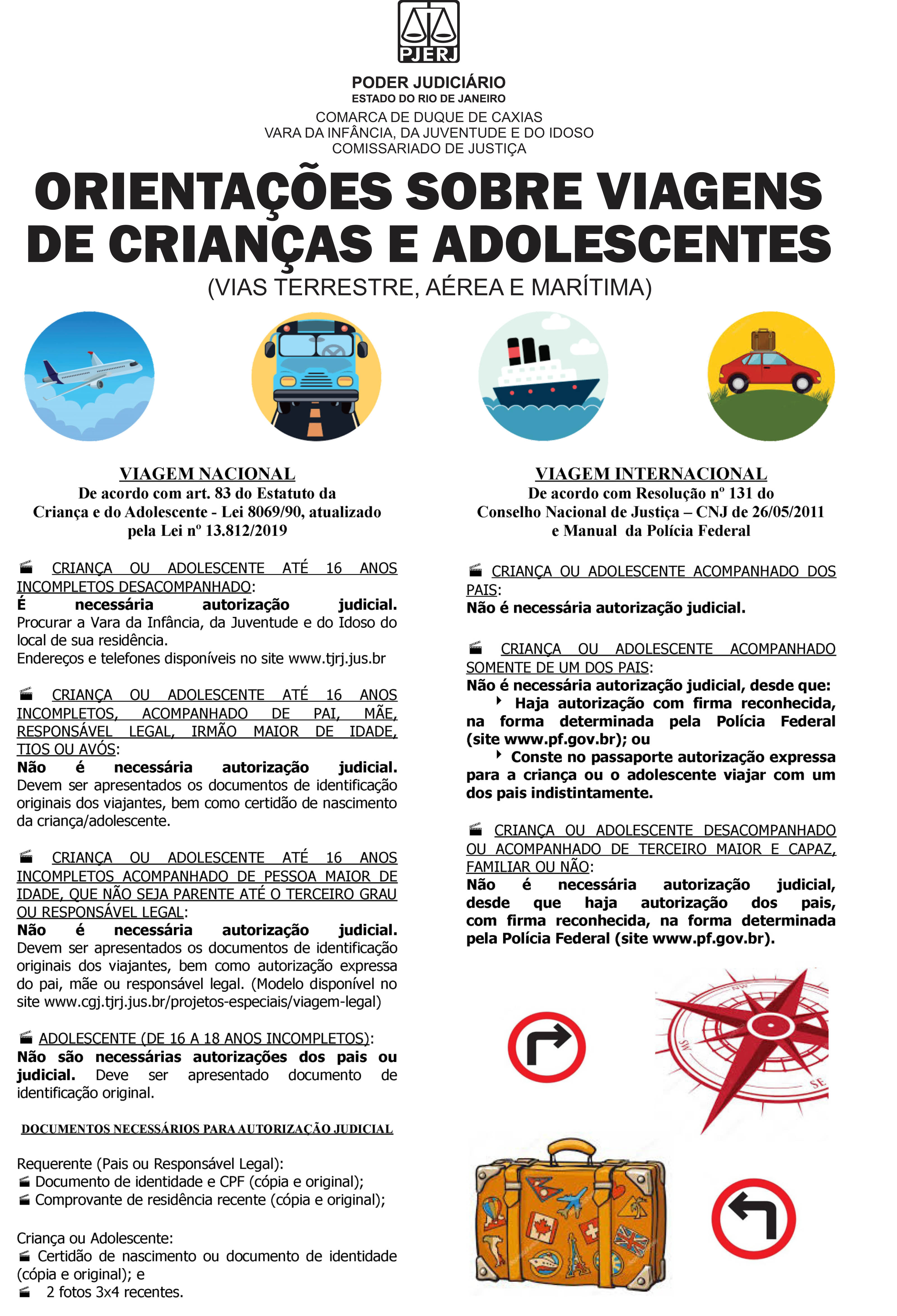 As novas regras para viagens de crianças e adolescentes por vias terrestre, aérea e marítima, nacionais e internacionais, estão detalhadas em cartilha lançada pela Vara da Infância, da Juventude e do Idoso de Duque de Caxias. De acordo com a juíza Juliana Kalichsztein, a publicação explica, de forma lúdica e resumida, as mudanças estabelecidas pela Lei 13.812/2019.