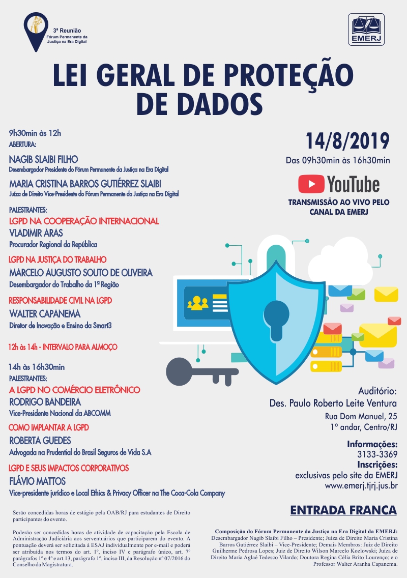 A Lei 13.709/18, conhecida como lei Geral de Proteção de Dados (LGPD), será debatida amanhã (14/8), das 9h30m às 12h, no auditório Desembargador Paulo Roberto Leite Ventura (Rua Dom Manuel 25, 1º andar - Centro) da Escola da Magistratura do Estado do Rio de Janeiro (Emerj). O evento é promovido pelo Fórum Permanente da Justiça na Era Digital. A entrada é gratuita.