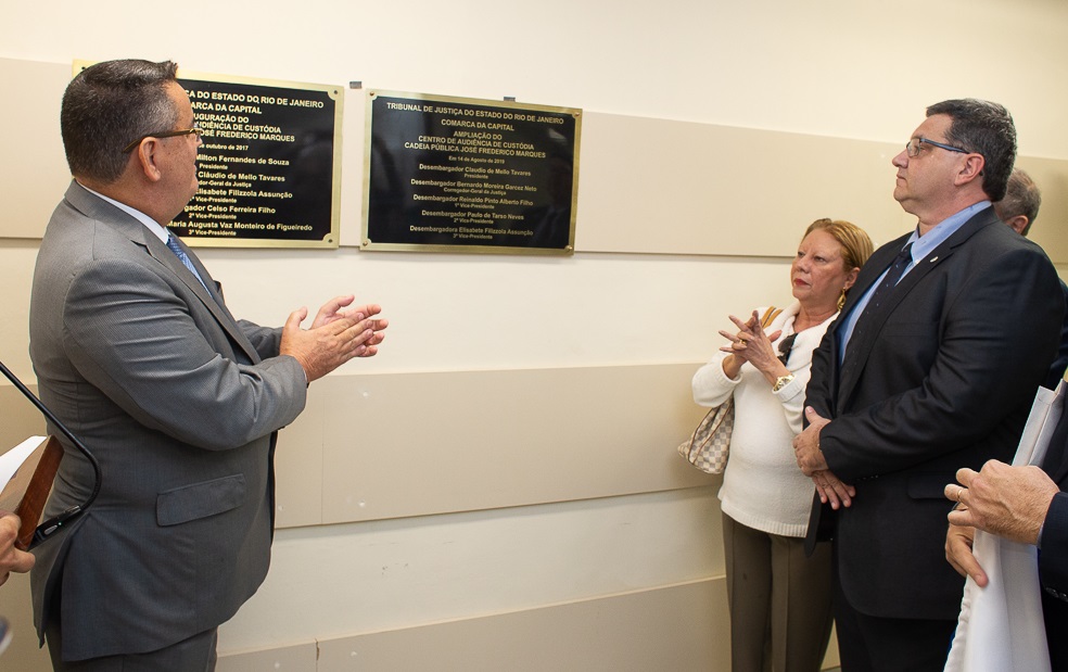 O presidente do Tribunal de Justiça do Estado do Rio de Janeiro, desembargador Claudio de Mello Tavares (à esquerda), inaugurou nesta quarta-feira (14/8) as novas instalações da Central de Audiência de Custódia de Benfica, na Zona Norte da cidade. Até então, a Central de Custódia de Benfica possuía duas carceragens masculinas com um total de 60 vagas e uma feminina, com 10 vagas. A partir de agora, a unidade conta com cinco carceragens masculinas, para um total de até 210 presos; uma feminina, para até 30 mulheres; e uma para militares e policiais presos.