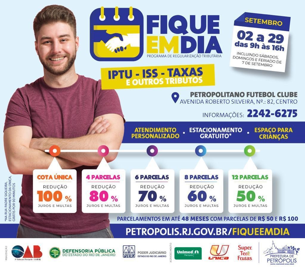 Os contribuintes de Petrópolis que estão em débito com os tributos municipais terão, a partir desta segunda-feira (2/09) e até 29 de setembro, a oportunidade de zerar suas dívidas. O Tribunal de Justiça do Estado do Rio de Janeiro (TJRJ) e a Prefeitura Municipal de Petrópolis vão, em parceria com outras instituições, realizar o “Fique em Dia”, no Clube Petropolitano Futebol Clube, na Av. Roberto Silveira, Centro, oferecendo a chance de negociação para pagamento das dívidas com o IPTU, ISS e outras taxas.