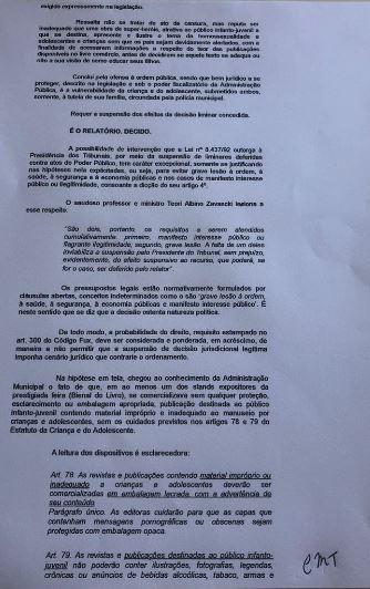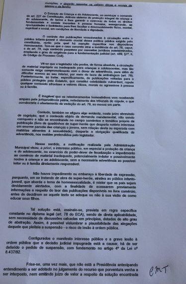 (...) Neste sentido, serve esta para notificar a entidade responsável por essa BIENAL DO LIVRO que, na forma da legislação federal e municipal, deverão ser recolhidas as obras que tratem do tema do homotransexualismo de maneira desavisada para o público jovem e infantil, ou seja, QUE NÃO ESTEJAM SENDO COMERCIALIZADAS EM EMBALAGEM LACRADA, COM ADVERTÊNCIA DE SEU CONTEÚDO, sob pena de apreensão dos livros e cassação de licença para a feira e demais que sejam cabíveis.”