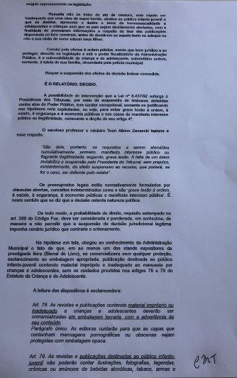 Como se trata de espaço aberto ao público, o que determinei, segundo meu convencimento, foi simplesmente o alerta sobre conteúdo delicado, para que os pais pudessem decidir ou participar da decisão de aquisição da obra, voltada ao leitor infanto-juvenil ainda em formação. Essa a razão da decisão.