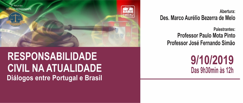 O Fórum Permanente de Direito Civil promove, no dia 9 de outubro, o evento “Responsabilidade Civil na Atualidade: Diálogos entre Portugal e Brasil”, na EMERJ. O evento será aberto pelo desembargador Marco Aurélio Bezerra de Melo, presidente do Fórum, e as palestras serão ministradas pelo mestre e doutor em Direito da Faculdade de Direito da Universidade de Coimbra, Paulo Mota Pinto, e pelo professor José Fernando Simão, mestre, doutor e livre-docente da USP.