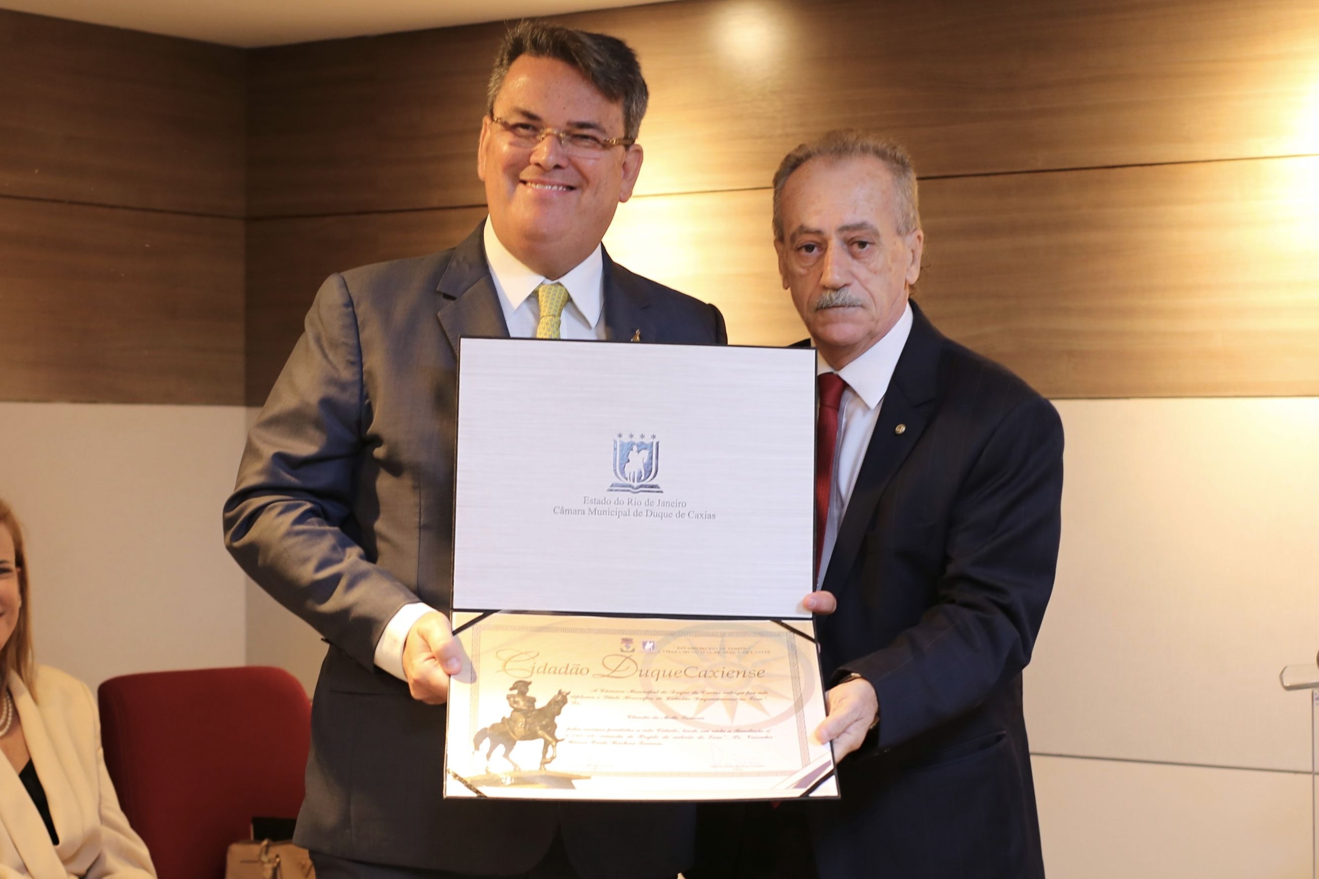 Coube ao vereador Nivan Almeida, de Duque de Caxias, entregar os títulos de Cidadão Duquecaxiense ao presidente do TJRJ e ao presidente da OAB/RJ, Luciano Bandeira. O presidente do Conselho Regional de Contabilidade, Waldir Jorge Ladeira dos Santos, foi agraciado com a Ordem do Mérito Contábil. Também participaram da mesa a vice-presidente da OAB-RJ, Ana Tereza Basílio, o desembargador federal do Tribunal Regional Federal da 2ª Região André Ricardo Cruz Fontes, e o presidente da Comissão de Direito Contábil da OAB/RJ, Márcio Benedito da Silva.