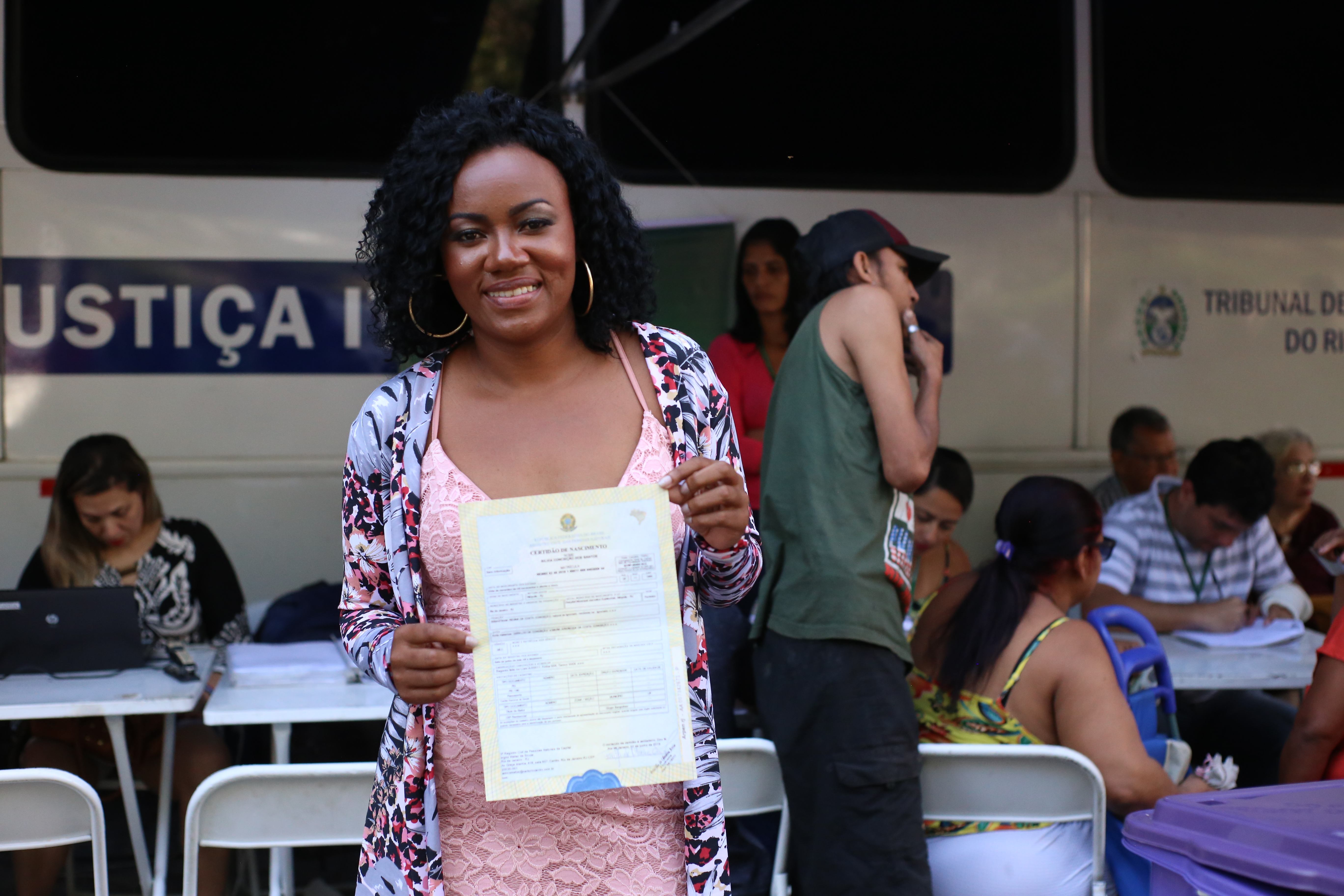 O processo para conseguir a documentação regularizada terminou após ela descobrir o ônibus do Programa Justiça Itinerante na Praça Onze. Com o apoio da equipe do Serviço de Promoção à Erradicação do Sub-registro e a Busca de Certidões (SEPEC), a manicure conseguiu concretizar a conversão de união estável em casamento com Leonardo da Silva Fraga, de 34 anos.