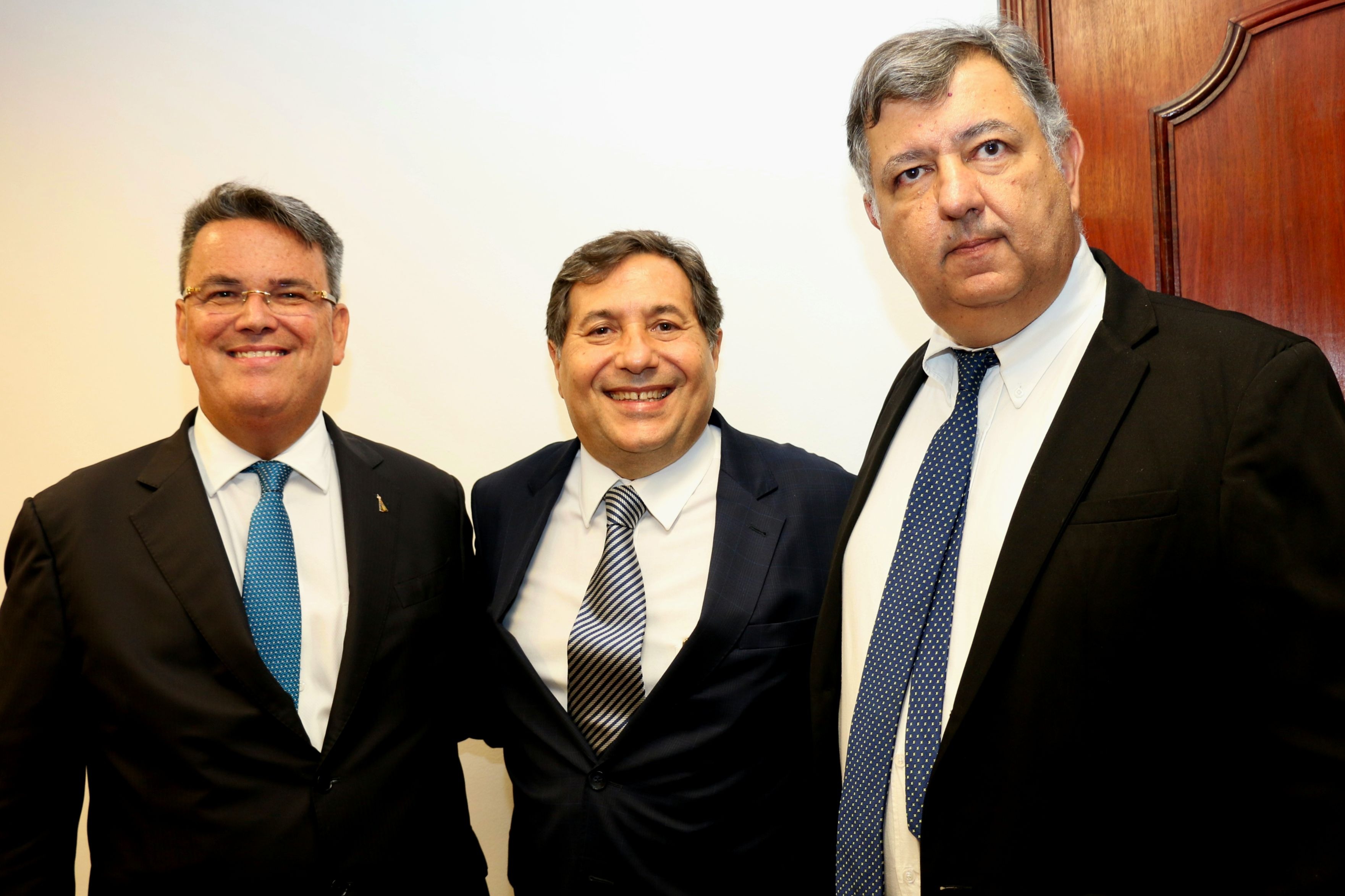 O presidente do TJRJ, desembargador Claudio de Mello Tavares, o desembargador Peterson Barroso Simão e o presidente do TRE-RJ, desembargador Cláudio Brandão de Oliveira