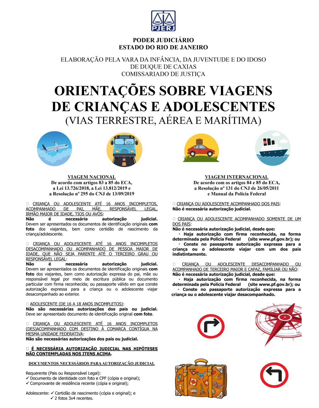 Para explicar de forma prática e simples as novidades da Lei 13.812, que alterou o artigo 83 do Estatuto da Criança e do Adolescente (ECA), em março do ano passado, e a nova resolução do CNJ, a Vara da Infância de Duque de Caxias produziu uma cartilha com as informações sobre viagens terrestres, aéreas, marítimas, nacionais e internacionais.