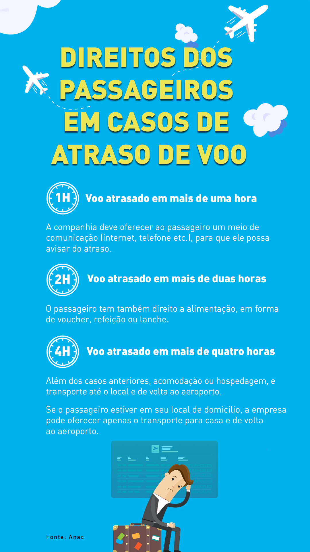 As empresas têm obrigações a cumprir, de acordo com normas da Agência Nacional da Aviação Civil. Em casos de atraso ou cancelamento de embarque, o passageiro tem direitos garantidos de acordo com o tempo de espera: