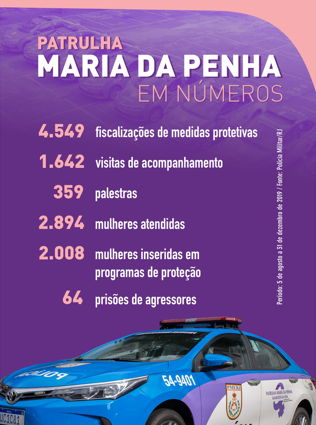 Mais do que fazer parte de uma triste estatística, Maria é uma das 2.894 mulheres atendidas pela Patrulha Maria da Penha – Guardiões da Vida no ano passado. Dessas, 2.089 vítimas foram inseridas no programa e acompanhadas pelos integrantes do projeto. Lançada no dia 5 de agosto, a iniciativa é uma parceria do Governo do Estado com o Tribunal de Justiça do Rio. O grupo motorizado especial atende casos de violência contra a mulher em todo o Estado do Rio de Janeiro, fiscalizando o cumprimento de medidas protetivas expedidas pelo Judiciário fluminense. Ao todo, foram 4.549 fiscalizações.