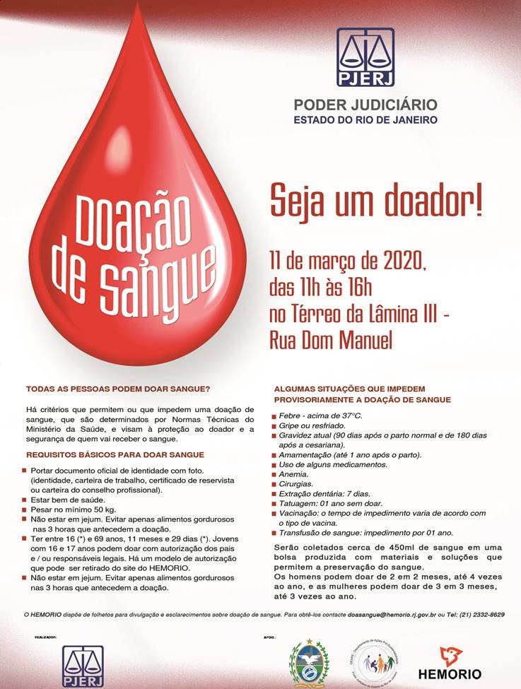 O Tribunal de Justiça do Estado do Rio de Janeiro (TJRJ) promove na próxima quarta-feira (11/3), no térreo da Lâmina III do Fórum Central, no Centro do Rio, em parceria com o Hemorio, nova campanha para doação de sangue, voltada para magistrados, servidores e funcionários terceirizados do Judiciário fluminense.