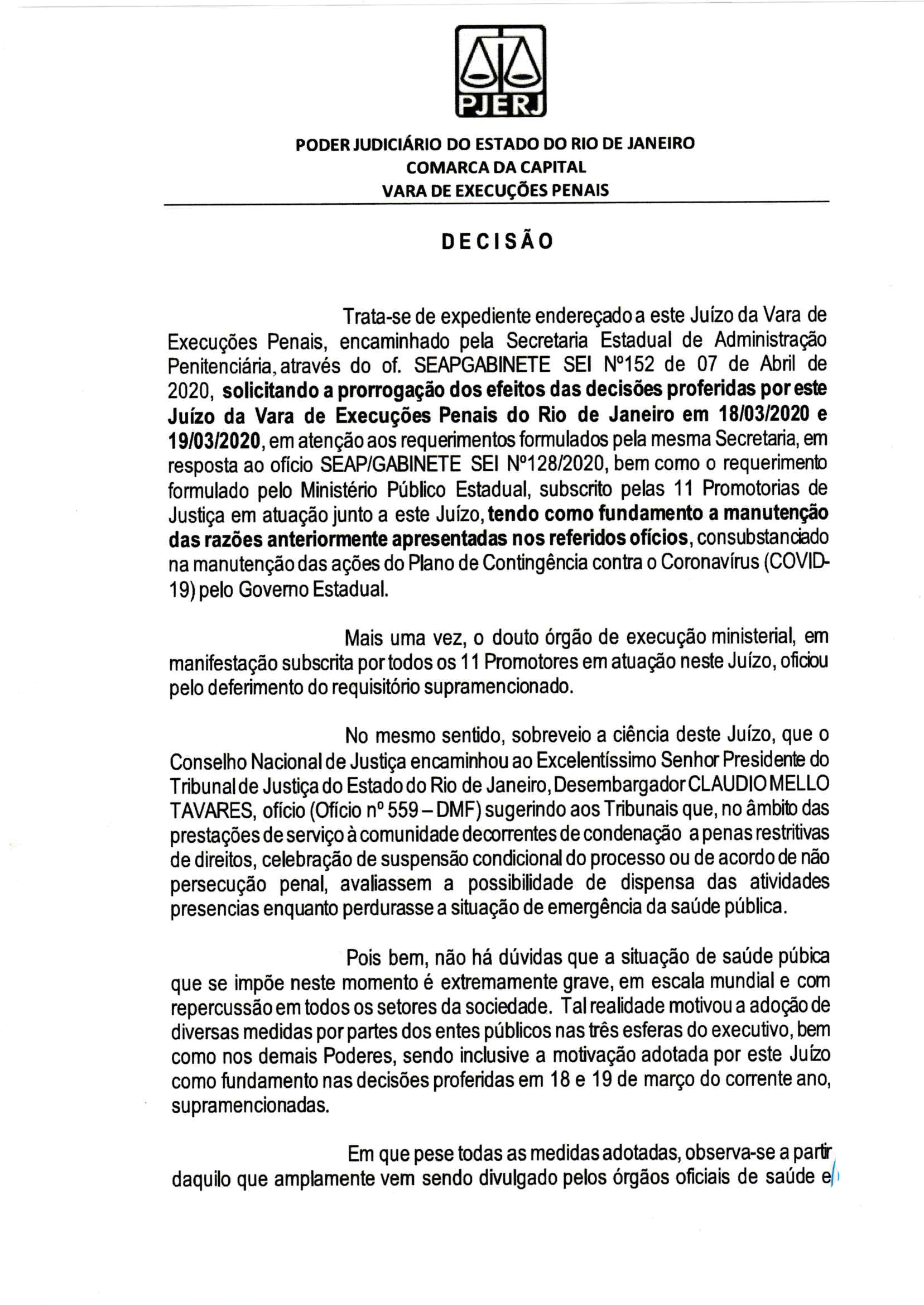 “Desta forma, entendo que permanecem presentes as razões expostas anteriormente e ressaltadas no ofício requisitório, a saber, ‘a situação de emergência de saúde pública do Estado do Rio de Janeiro e a imprescindibilidade de adoção de prevenção da doença no sistema penitenciário deste Estado...”.