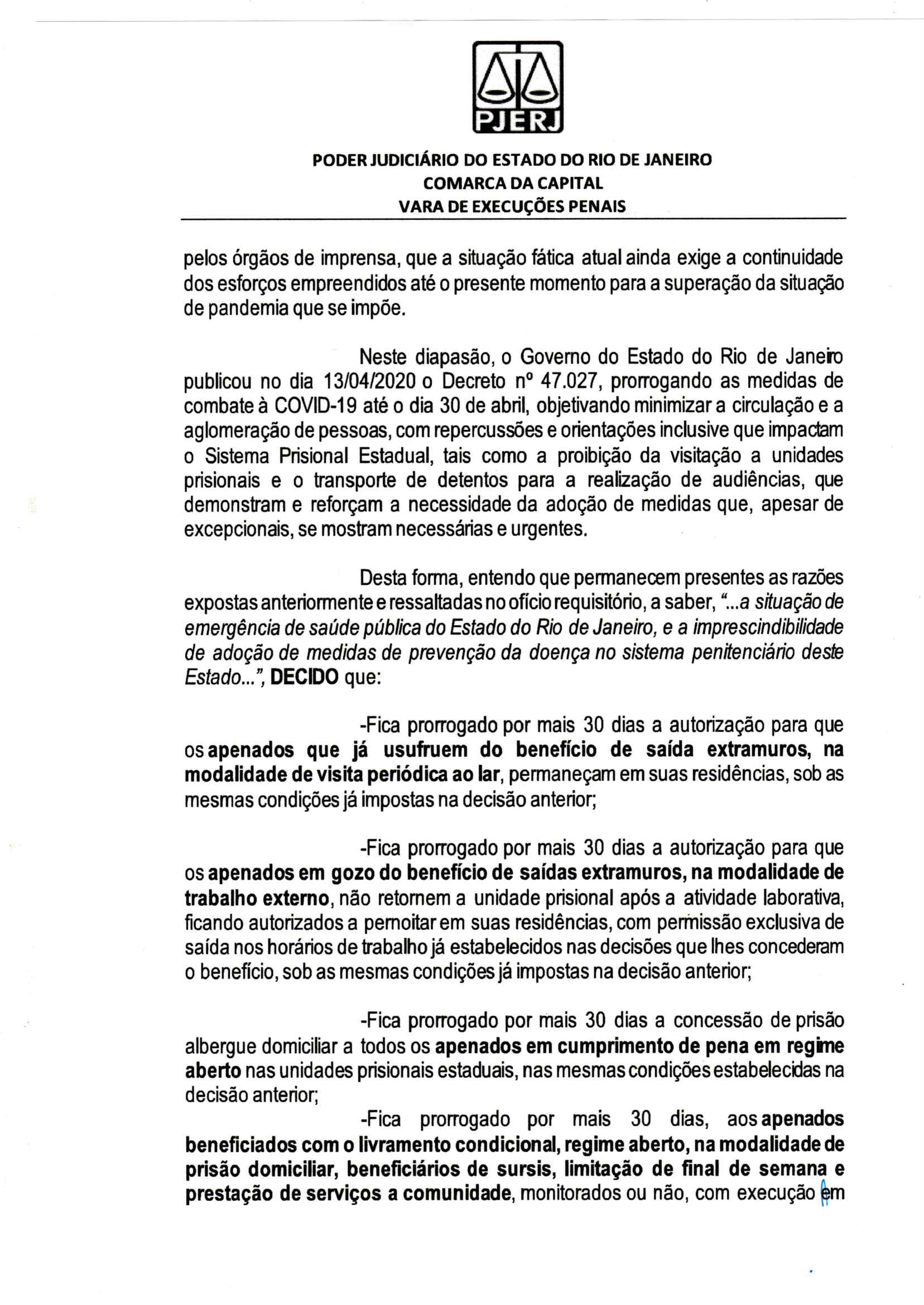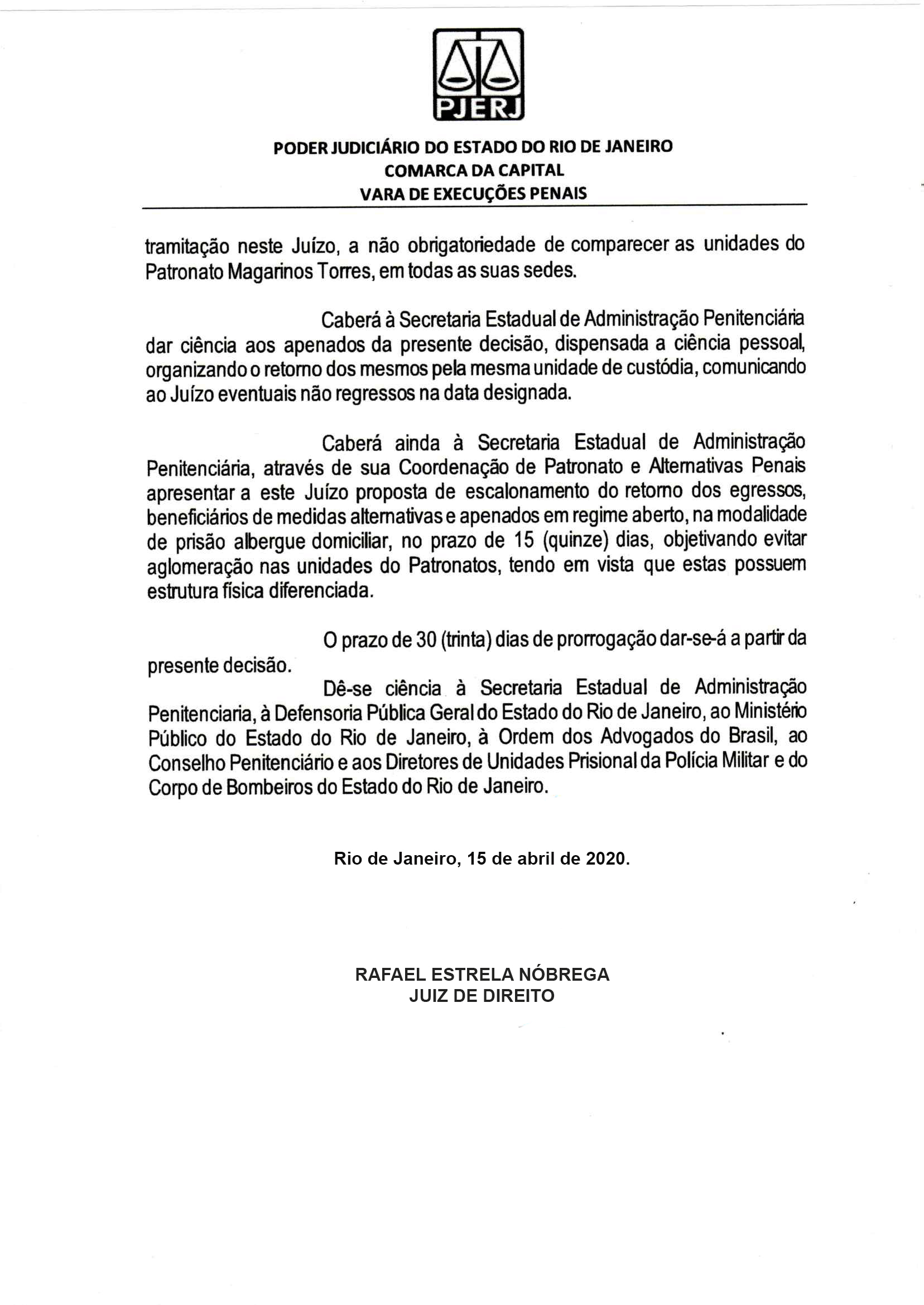 A Vara de Execuções Penais do Rio de Janeiro (VEP) prorrogou por mais 30 dias a autorização para que os presos do regime aberto, do semiaberto que já podiam sair para trabalhar ou fazer a visita periódica ao lar e dos beneficiados com livramento condicional permaneçam em suas casas durante as medidas de combate à Covid-19. A decisão, assinada nesta quarta-feira (15/3) pelo juiz Rafael Estrela, atendeu aos pedidos feitos pela Secretaria estadual de Administração Penitenciária (Seap) e por 11 Promotorias de Justiça que atuam junto à VEP. As decisões anteriores haviam ocorrido nos dias 18 e 19 de março.
