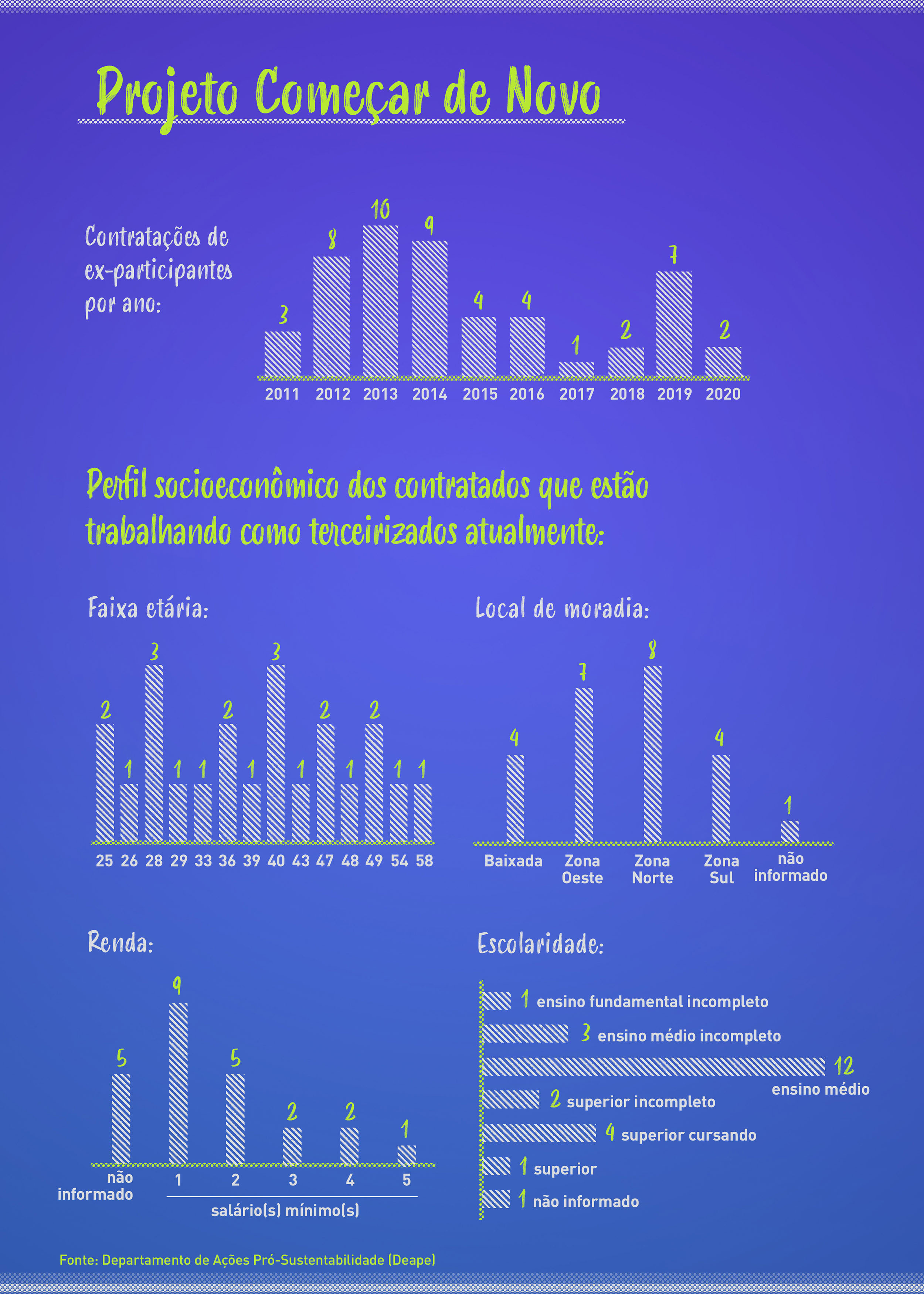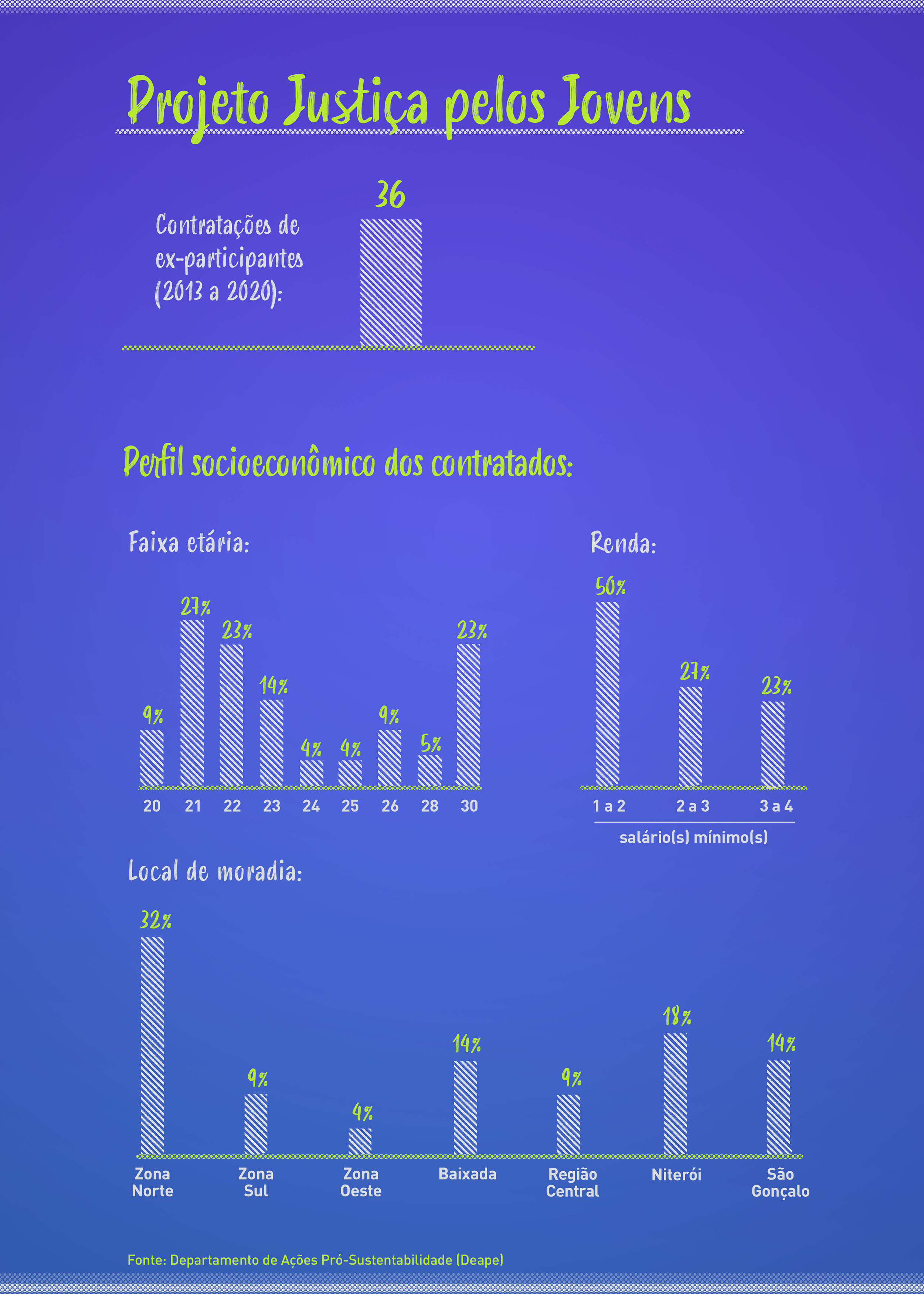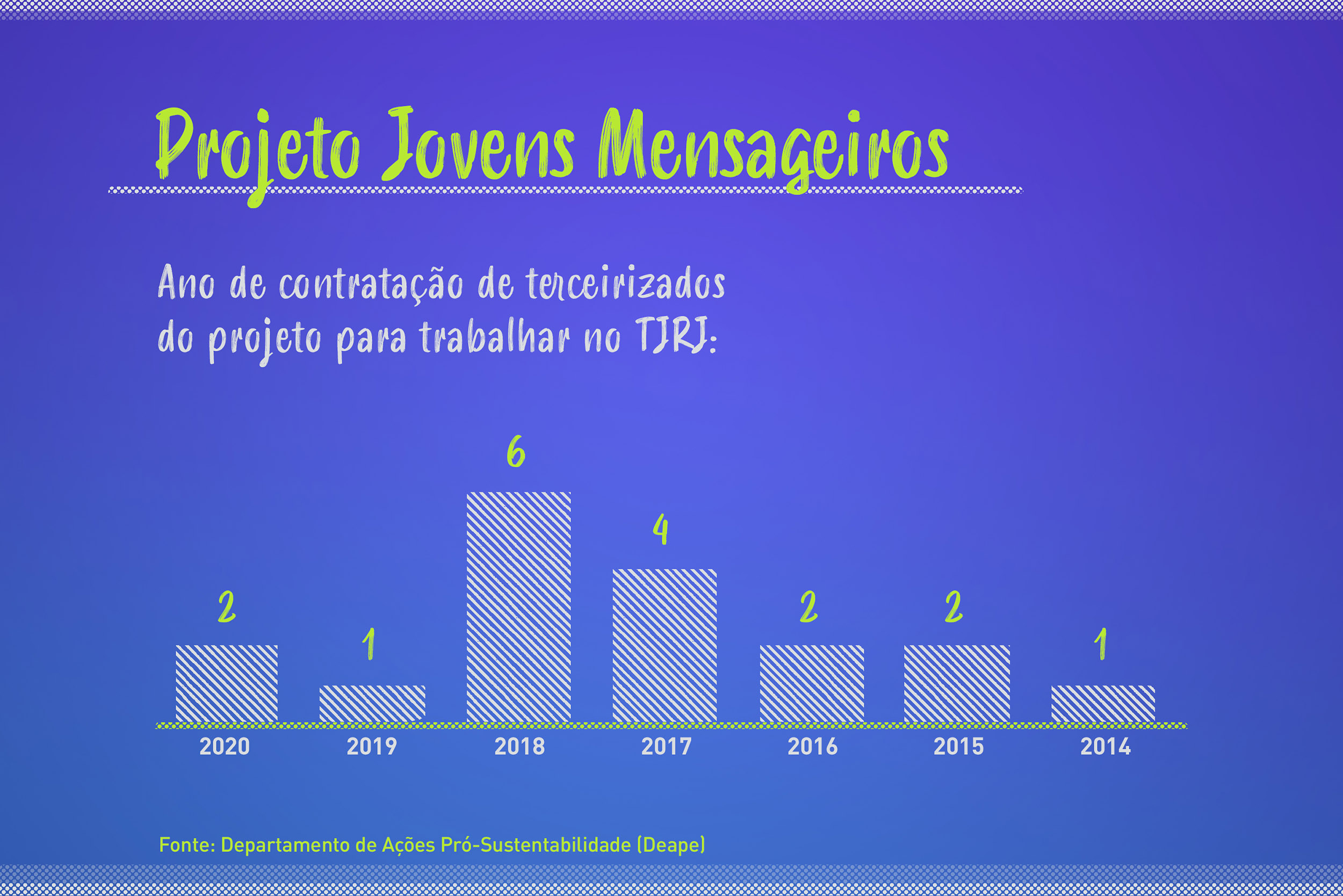 Os projetos sociais do TJRJ têm sido um importante instrumento de recomeço para muitos dos seus participantes. Dois deles, o Começar de Novo e o Justiça pelos Jovens, têm como seus integrantes, respectivamente, egressos do sistema penitenciário e jovens que já tiveram conflitos com a lei no passado. E, neles, a meritocracia também é a palavra de ordem, como acontece no Jovens Mensageiros. De 2011 a 2020, já foram contratados 88 ex-participantes das duas iniciativas como terceirizados.