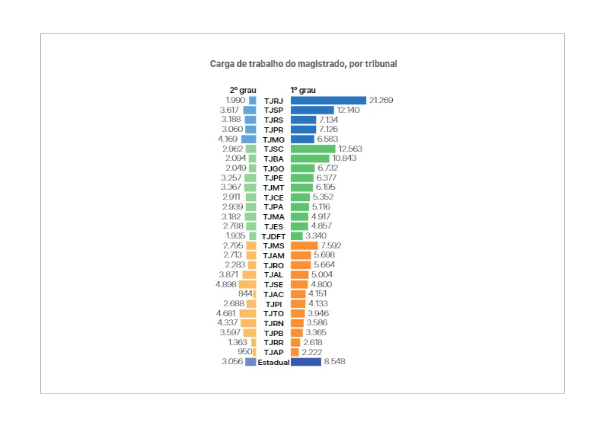 Já na carga de trabalho, a diferença do Judiciário fluminense frentes aos demais impressiona. Juízes de primeiro grau possuem uma carga de 21.269 ações, 75% a mais que um magistrado do TJSP, com 12.140 registros e na vice-liderança dos tribunais de grande porte.