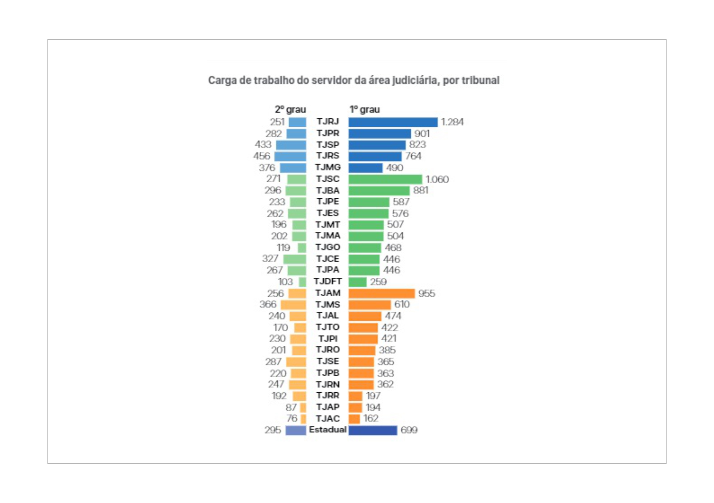 O panorama é o mesmo com os serventuários. A carga de trabalho de um servidor é de 1.284, 42% superior ao registrado no Tribunal de Justiça do Paraná, o segundo lugar entre as cortes de maior envergadura.