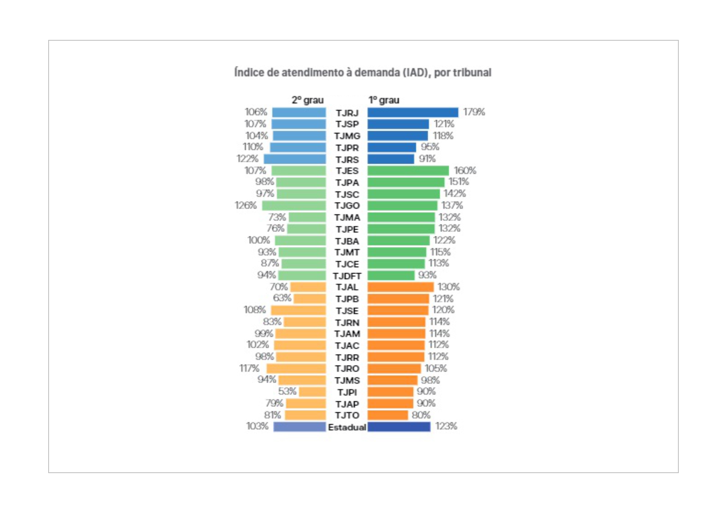 Outro índice que apontou o TJ do Rio como protagonista foi o chamado Índice de Atendimento à Demanda (IAD). Esse cálculo reflete a capacidade das cortes judiciais em dar vazão ao volume de casos ingressados. O nível de informatização dos tribunais é calculado considerando o total de casos novos ingressados eletronicamente em relação ao total de casos novos físicos e eletrônicos e desconsideradas as execuções judiciais iniciadas.