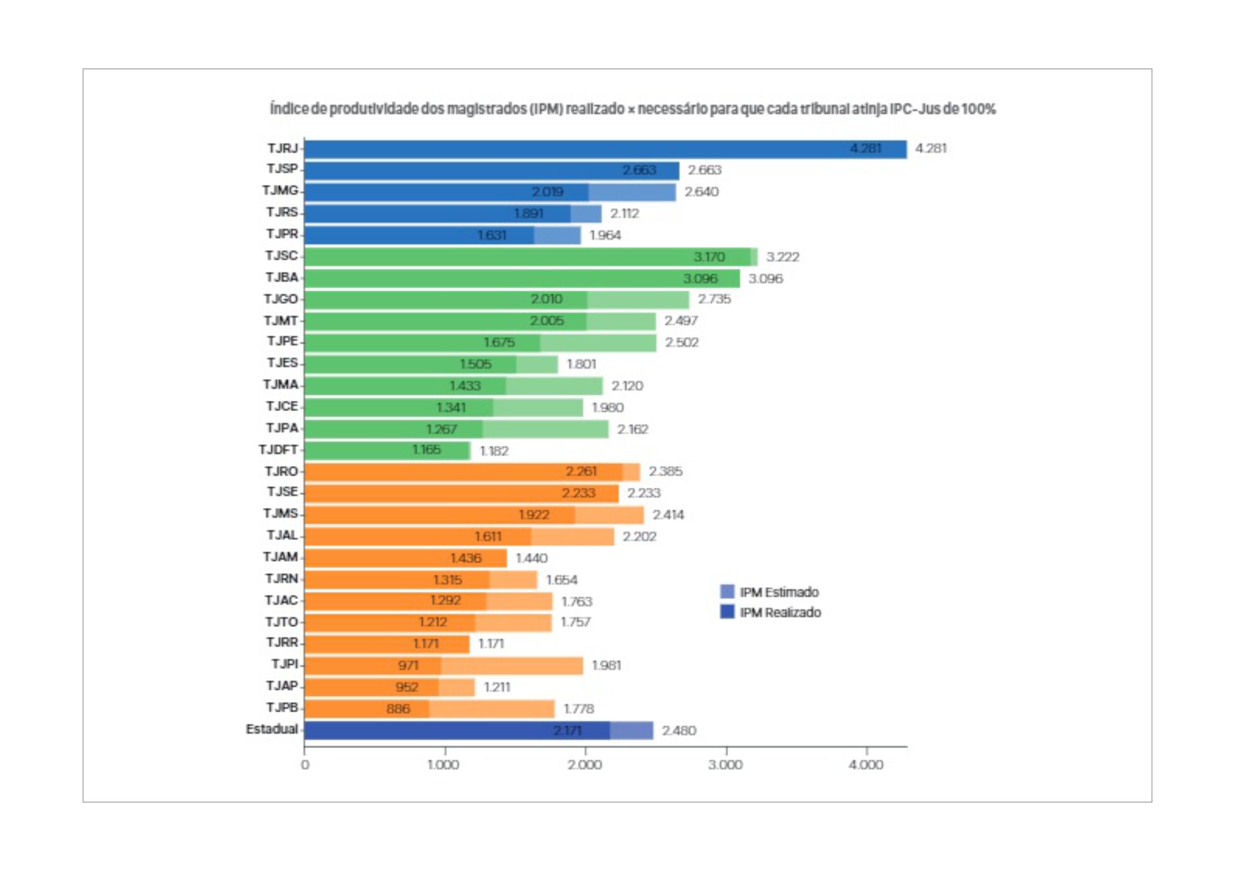 O TJRJ ocupou a primeira posição nacional do Índice de Produtividade dos Magistrados (IPM), que é calculado pela relação entre o volume de casos baixados e o número de magistrados e servidores que atuaram durante o ano na jurisdição.