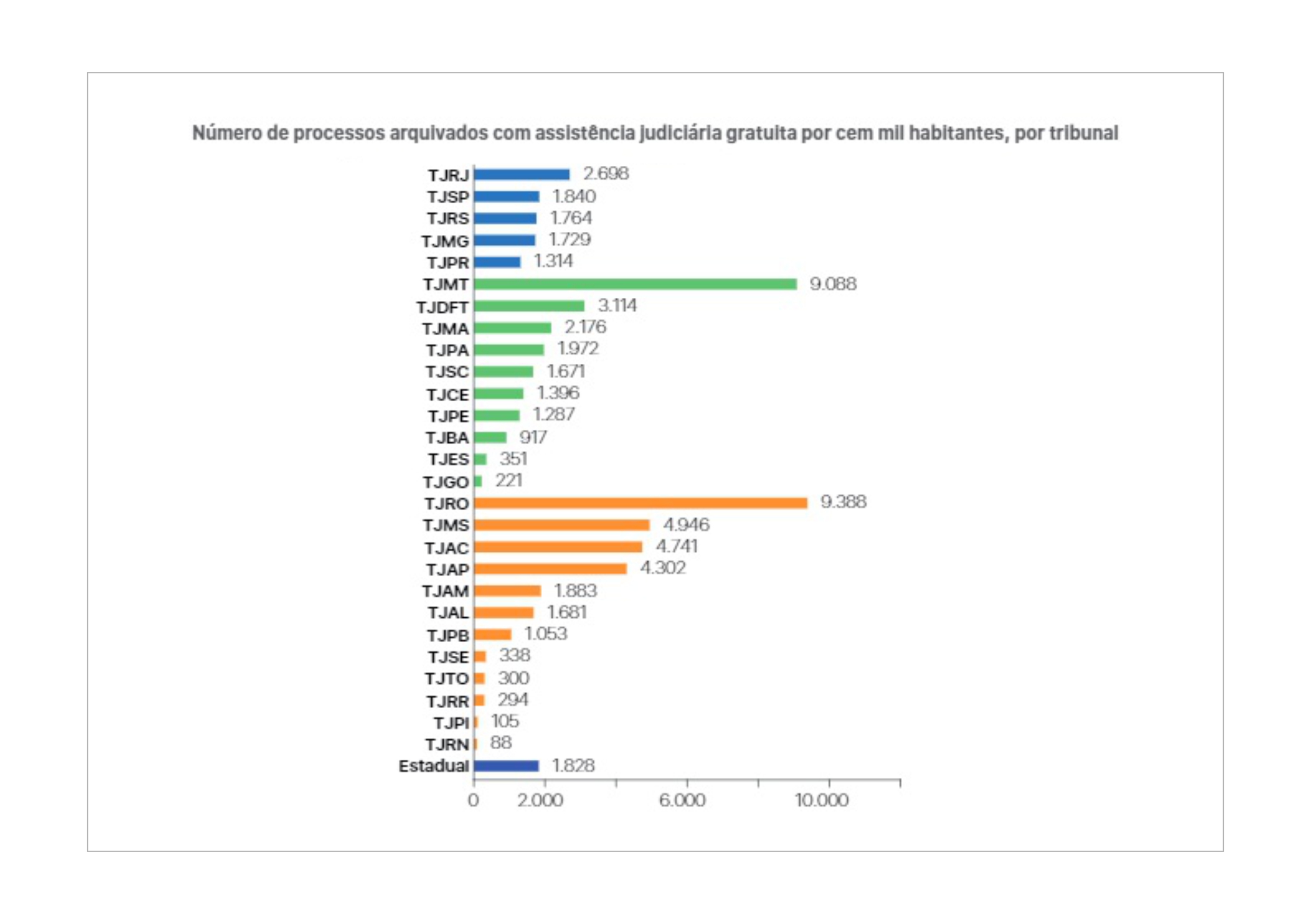 Quanto ao número de processos arquivados com assistência judiciária gratuita por 100.000 habitantes, o TJRJ ficou em primeiro lugar nos tribunais de grande porte, com 2.698 ações, seguido pelos tribunais de São Paulo (1.840) e do Rio Grande do Sul (1.764).