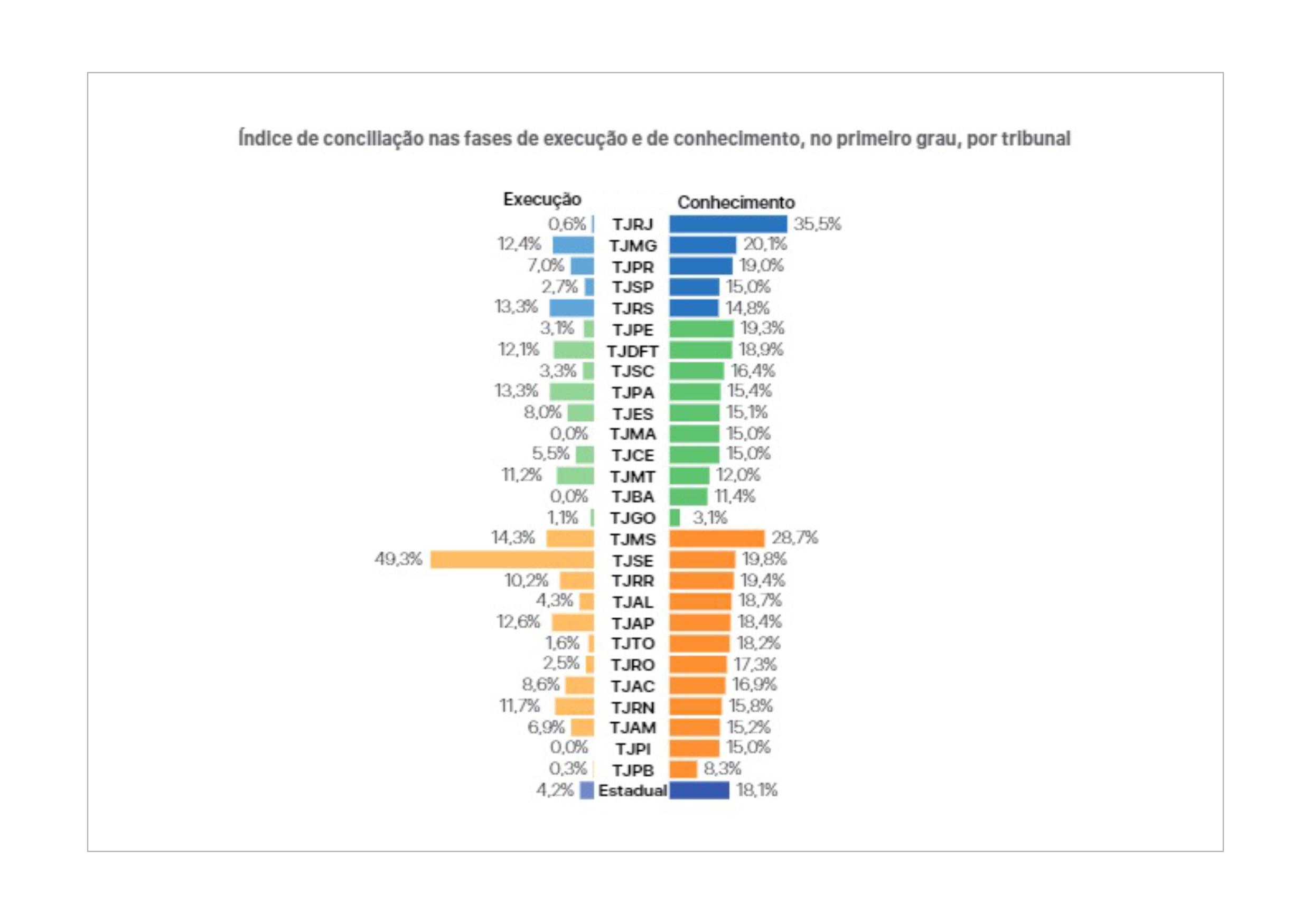 Nas fases processuais de execução e de conhecimento, o TJRJ ficou em primeiro lugar no índice de conciliação no 1º grau, com 35% na fase de conhecimento e 0,6% na execução.