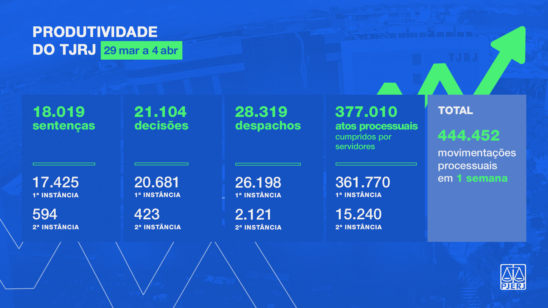 O Tribunal de Justiça do Estado do Rio de Janeiro produziu, na semana de 29 de março a 4 de abril, 18.019 sentenças (17.425 na primeira instância e 594 na segunda instância), 21.104 decisões (20.681 na primeira instância e 423 na segunda instância) e 28.319 despachos (26.198 na primeira instância e 2.121 na segunda instância). No mesmo período, foram cumpridos 377.010 atos por servidores (361.770 na primeira instância e 15.240 na segunda instância).