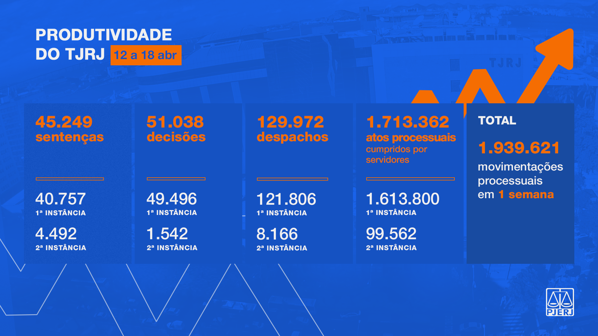 O Tribunal de Justiça do Estado do Rio de Janeiro produziu, na semana de 12 a 18 de abril, 45.249 sentenças (40.757 na primeira instância e 4.492 na segunda instância), 51.038 decisões (49.496 na primeira instância e 1.542 na segunda instância) e 129.972 despachos (121.806 na primeira instância e 8.166 na segunda instância). No mesmo período, foram cumpridos 1.713.362 atos por servidores (1.613.800 na primeira instância e 99.562 na segunda instância).
