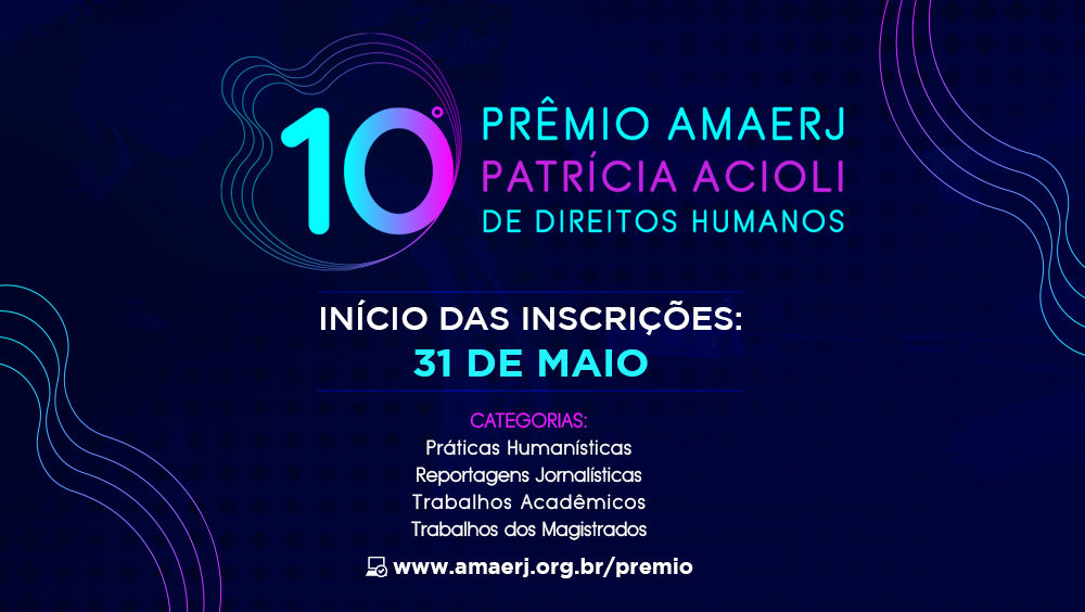 As inscrições para o 10º Prêmio AMAERJ Patrícia Acioli de Direitos humanos serão abertas a partir do dia 31 de maio. A premiação, promovida pela Associação dos Magistrados do Estado do Rio de Janeiro, é dividida em quatro categorias: Práticas Humanísticas, Trabalhos Acadêmicos, Trabalhos dos Magistrados e Reportagens Jornalísticas.
