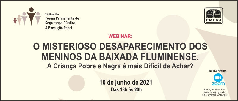 O Fórum Permanente de Segurança Pública e Execução Penal da Escola da Magistratura do Estado do Rio de Janeiro (Emerj), em sua 22ª reunião, promoverá, no dia 10 de junho, às 18h, via Zoom e YouTube, uma ampla discussão a respeito do assunto no webinar “O misterioso desaparecimento dos meninos da Baixada Fluminense: a criança pobre e negra é mais difícil de achar?”. Haverá tradução para Língua Brasileira de Sinais (Libras).