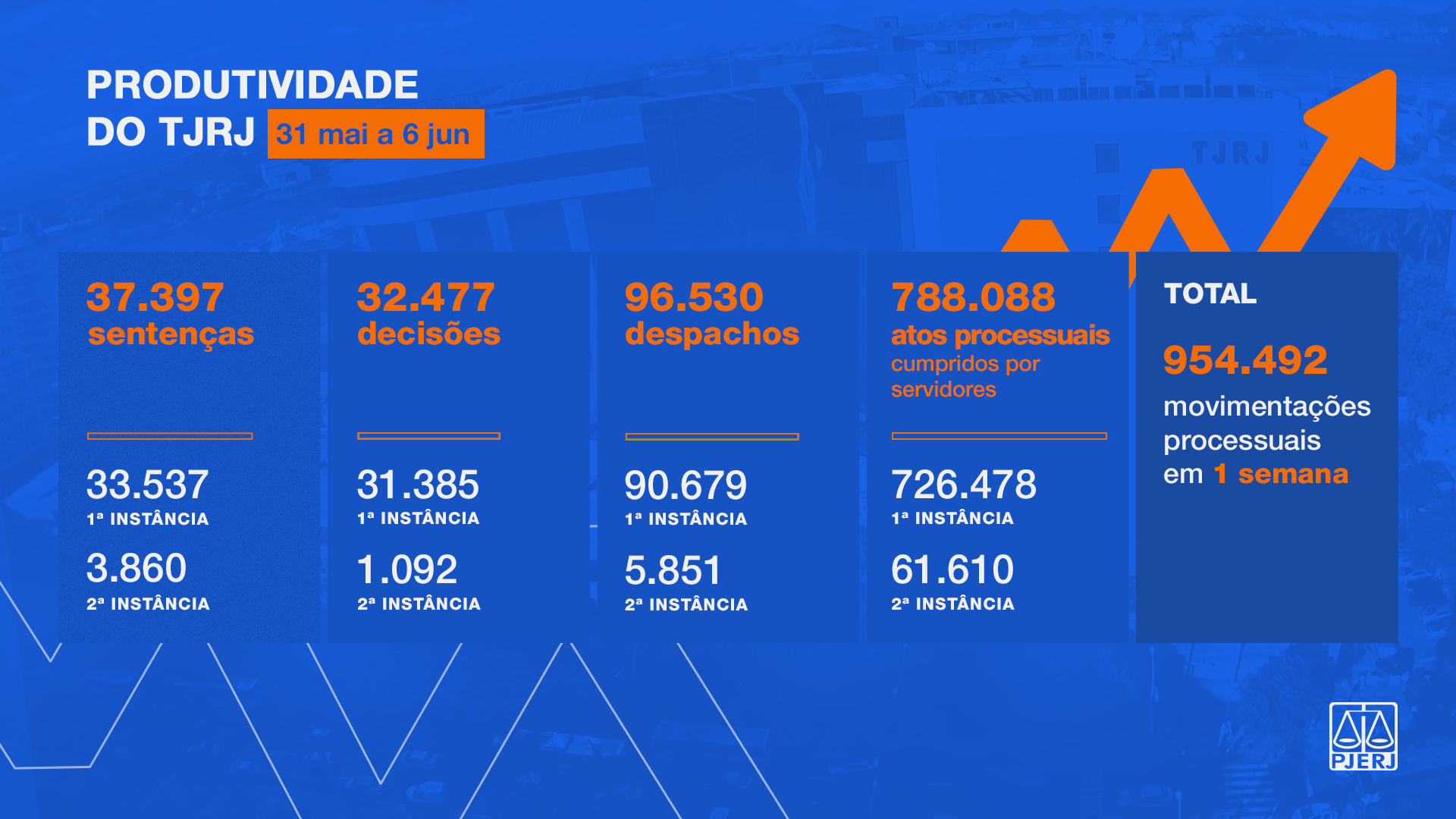 O Tribunal de Justiça do Estado do Rio de Janeiro produziu, na semana de 31 de maio a 6 de junho, 37.397 sentenças (33.537 na primeira instância e 3.860 na segunda instância), 32.477 decisões (31.385 na primeira instância e 1.092 na segunda instância) e 96.530 despachos (90.679 na primeira instância e 5.851 na segunda instância). No mesmo período, foram cumpridos 788.088 atos por servidores (726.478 na primeira instância e 61.610 na segunda instância).