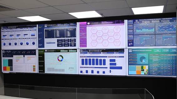 Ao final dos procedimentos licitatórios foram instaladas 8 telas de 55 polegadas, bem como um gerenciador gráfico (servidor) para auxiliar a equipe de estatísticos no desempenho de suas funções bem como foram contratados 34 profissionais que atuam em todas as etapas relacionadas à análise de dados, desde a sua aquisição até a formulação de painéis estatísticos.