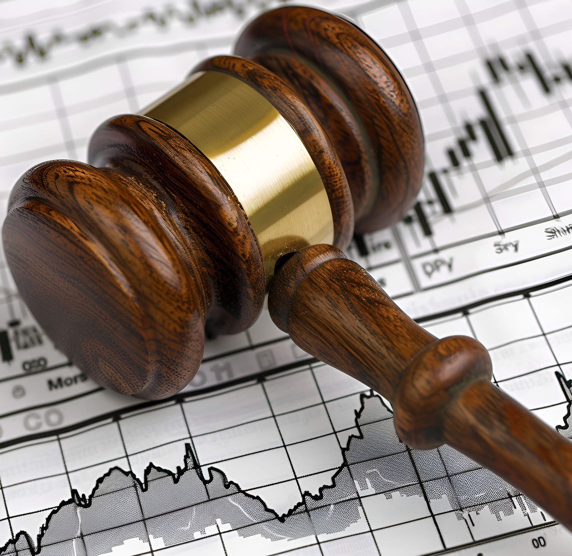 Imagem de um martelo de madeira sobre um papel com gráficos desenhados.