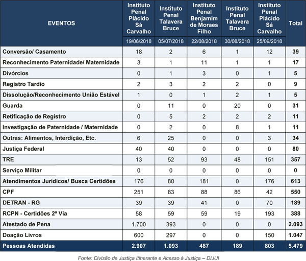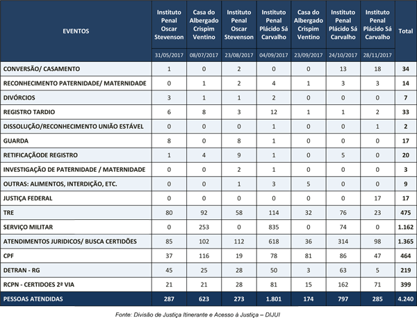 A proposta é levar a Justiça Itinerante ao sistema penitenciário, especialmente para atender as demandas dos detentos e seus familiares, nas áreas de família, infância, juventude e idoso e registro civil de forma a alinhar a missão institucional do Poder Judiciário com as políticas públicas destinadas a ressocialização da população carcerária.