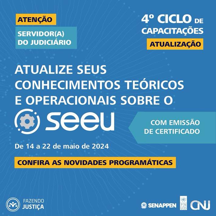 É servidor ou servidora do Judiciário e opera o Sistema Eletrônico de Execução Unificado (SEEU) no dia a dia? Saiba como aproveitar todas as funcionalidades do sistema no *4º Ciclo de Capacitações do SEEU de 2024*. A primeira edição de 2024 contará com *seis turmas* divididas por tema. As novidades programáticas deste ano são exposições adicionais sobre as *Resoluções do CNJ acerca de qualificação das partes e populações com vulnerabilidade acrescida* e *Segurança da Informação na Perspectiva do Usuário*.