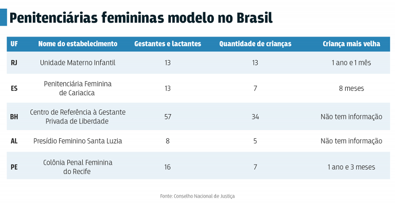 Das 24 unidades prisionais femininas visitadas pelo Conselho Nacional da Justiça (CNJ) em 2018, quatro delas se destacam como exemplo de boas práticas e no atendimento à mulher. São elas: Unidade Materno Infantil (RJ), Penitenciária Feminina de Cariacica (ES), Presídio Feminino Santa Luzia (AL) e Colônia Penal Feminina do Recife (PE).