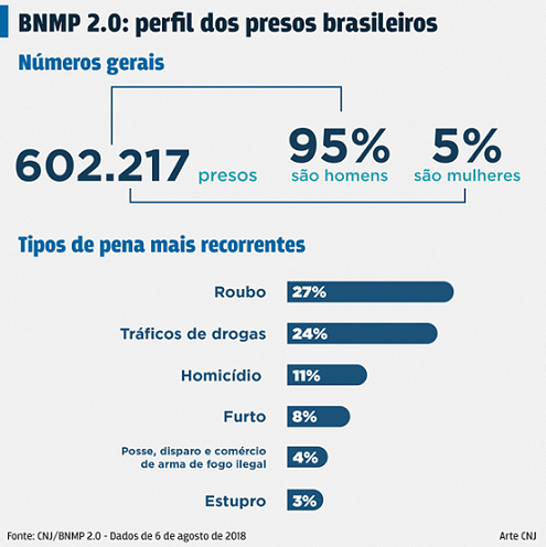 A presidente do Conselho Nacional da Justiça (CNJ) e do Supremo Tribunal Federal (STF), ministra Cármen Lúcia, apresentou, nesta terça-feira (7/8), para os conselheiros do CNJ a nova versão do Banco Nacional de Monitoramento de Presos (BNMP 2.0). De acordo com os dados parciais apresentados pela ministra aos conselheiros, existem atualmente no Brasil 602.217 presos, dos quais 95% são homens e 5% são mulheres. Cerca de 40% são presos provisórios e 27% respondem por roubo.