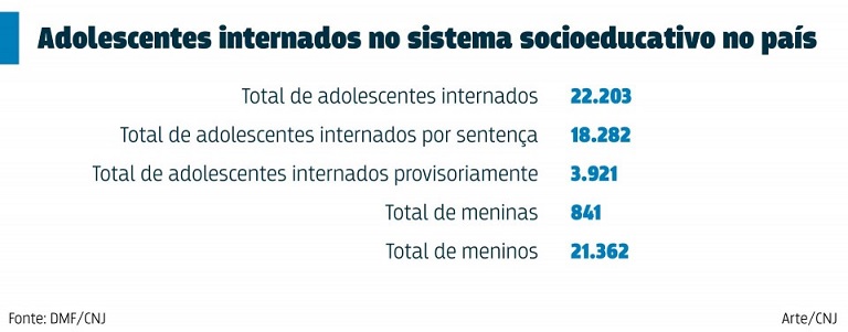 Levantamento feito pelo Departamento de Monitoramento e Fiscalização do Sistema Carcerário e das Medidas Socioeducativas do Conselho Nacional de Justiça (DMF/CNJ) sobre o quantitativo de menores infratores em regime de internação no Brasil mostra que existem hoje mais de 22 mil jovens internados nas 461 unidades socioeducativas em funcionamento em todo o país.