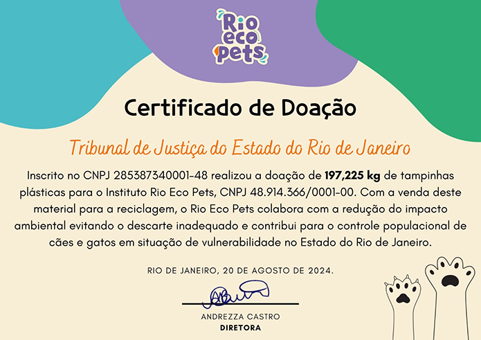Certificado de Doação Tribunal de Justiça do Estado do Rio de Janeiro Inscrito no CNPJ 285387340001-48 realizou a doação de 197,225 kg de tampinhas plásticas para o Instituto Rio Eco Pets, CNPJ 48.914.366/0001-00. Com a venda deste material para a reciclagem, o Rio Eco Pets colabora com a redução do impacto ambiental evitando o descarte inadequado e contribui para o controle populacional de cães e gatos em situação de vulnerabilidade no Estado do Rio de Janeiro. RIO DE JANEIRO, 20 DE AGOSTO DE 2024. ANDREZZA CASTRO DIRETORA