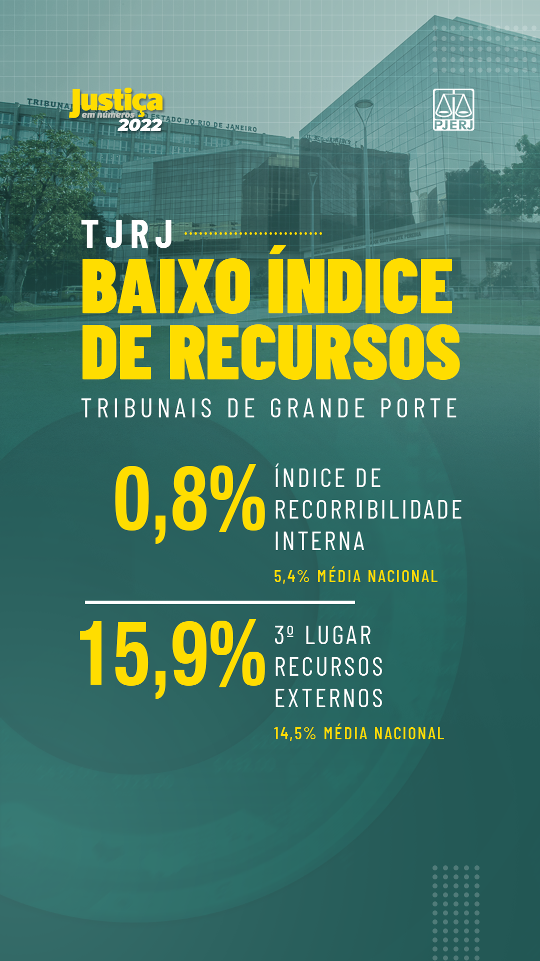 Em seu segmento, o TJ do Rio atingiu em 2021 o menor índice de recorribilidade interna com 0,8% - a média nacional foi de 5,4%.  E ficou em terceiro lugar em relação aos recursos externos, com 15,9% - a média nacional foi de 14,5%.