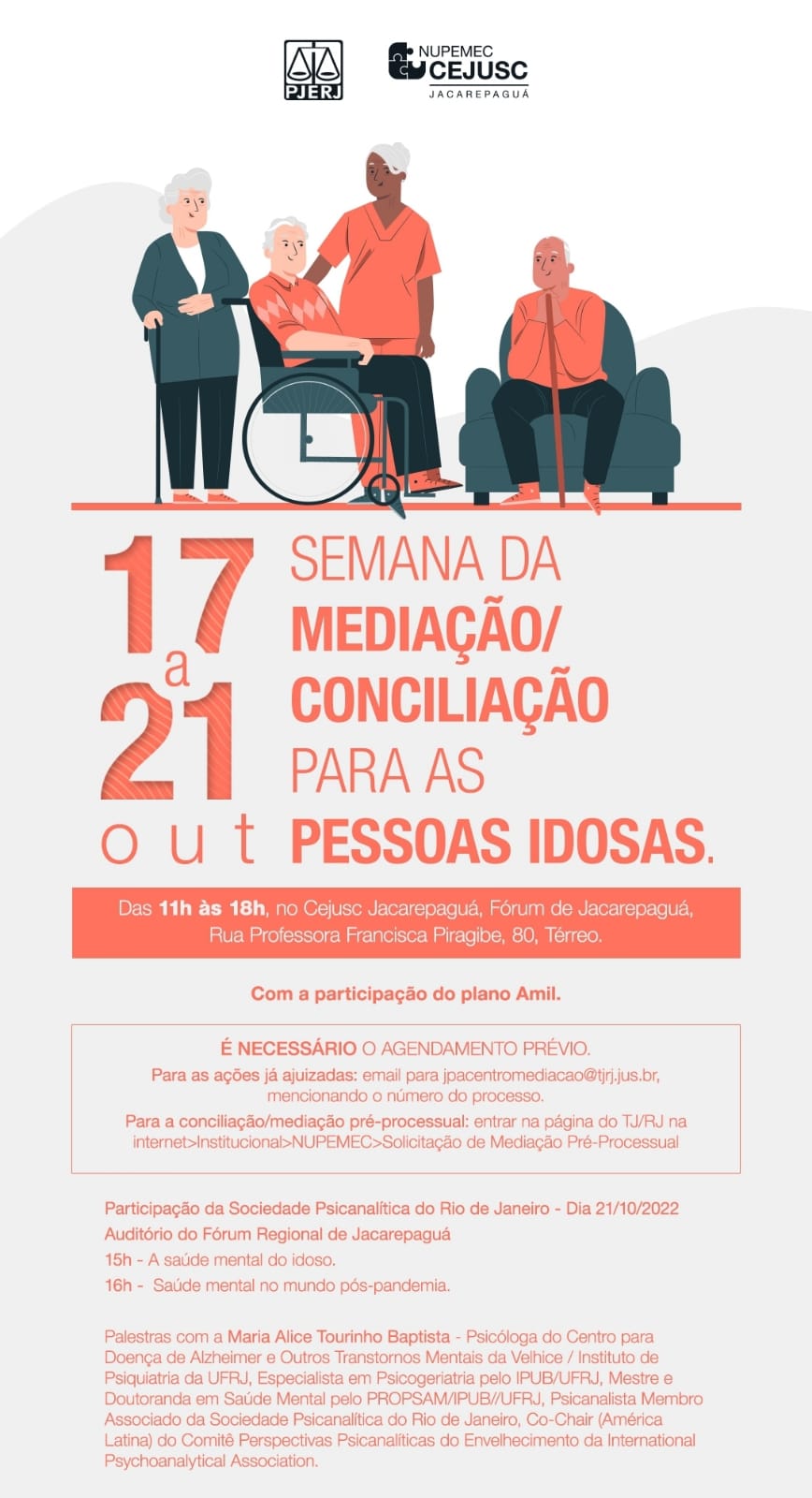 Além das sessões de mediação e conciliação, o CEJUSC de Jacarepaguá promove palestras, no dia 21/10, a partir das 15h. Os encontros vão abordar os temas saúde mental do idoso e saúde mental no mundo pós-pandemia.