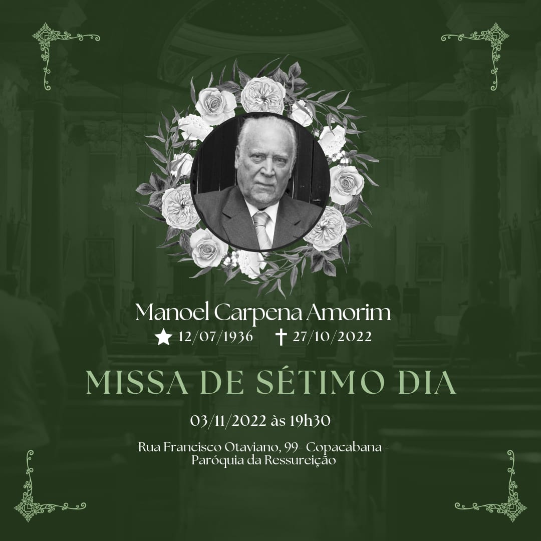 A missa de 7º dia do desembargador Manoel Carpena Amorim será rezada às 19h30 desta quinta-feira (3/11), na Paróquia da Ressurreição, localizada à Rua Francisco Otaviano, n. 99 – Copacabana. Carpena Amorim faleceu aos 86 anos.