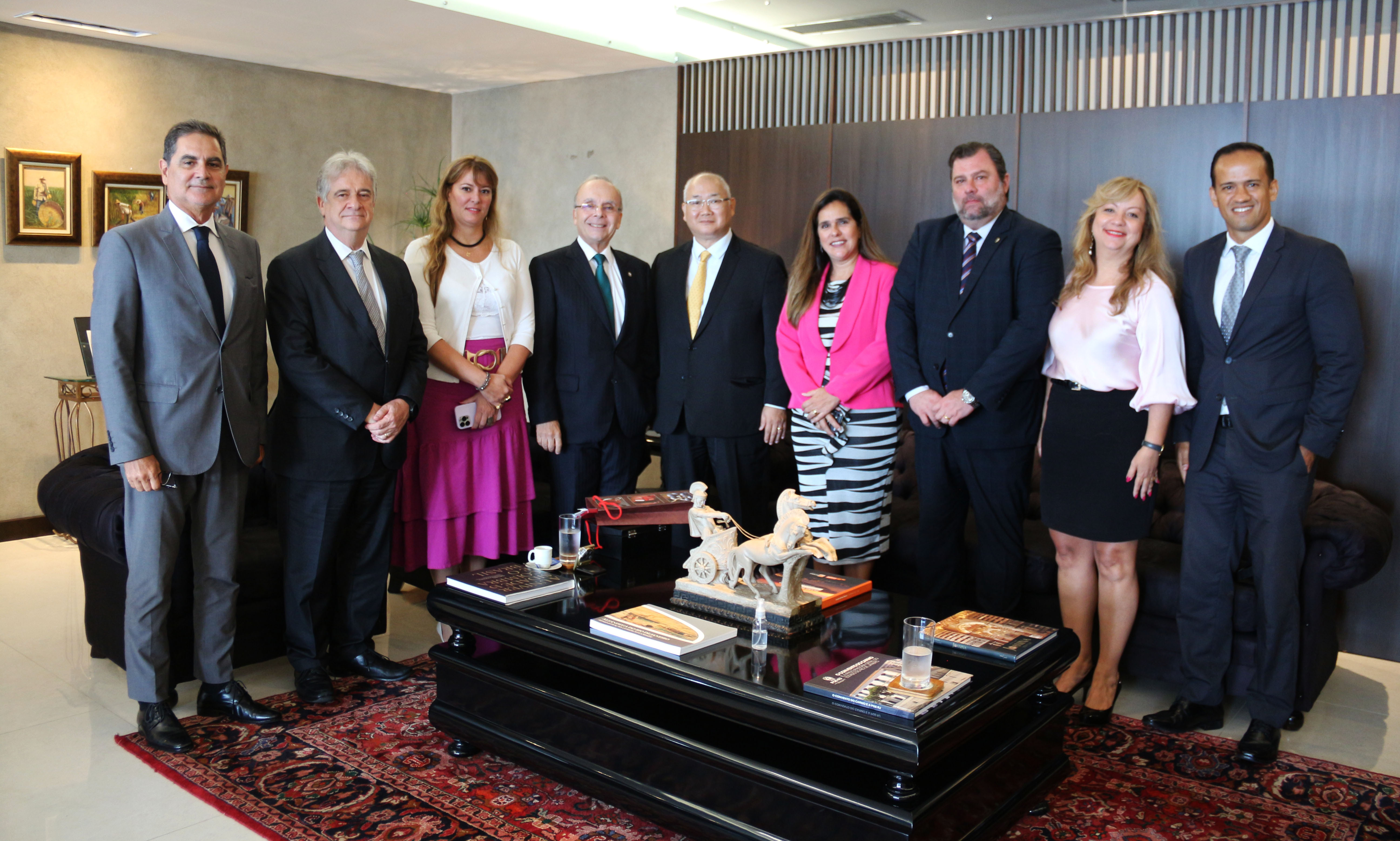 O presidente do TJRJ, desembargador Ricardo Rodrigues Cardozo (ao centro), com os desembargadores Agostinho Teixeira de Almeida Filho e Mauro Dickstein; a juíza auxiliar da Presidência, Renata Guarino Martins; o conselheiro do Comitê Nacional do CNJ, Richard Paes Kim; a secretária de Administração do TJRJ, Jacqueline Leite Vianna Campos; os juízes Vitor Moreira Lima e Maria Cristina Barros Gutiérrez Slaibi, com o secretário Márcio Diniz.