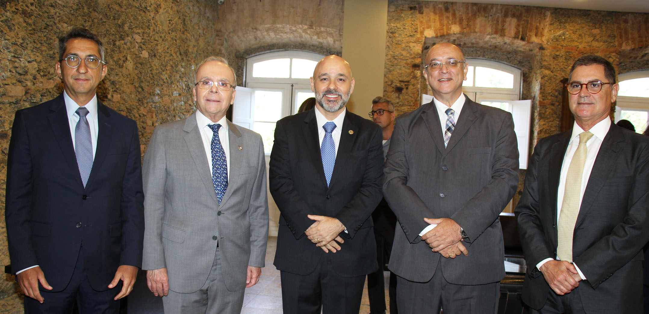 O desembargador Cesar Cury, o presidente do TJRJ, desembargador Ricardo Cardozo, o vice-presidente do TCE, Marcio Pacheco, o presidente do TRE, João Ziraldo,  e o desembargador Agostinho Teixeira participaram do seminário na sede do TCE-RJ