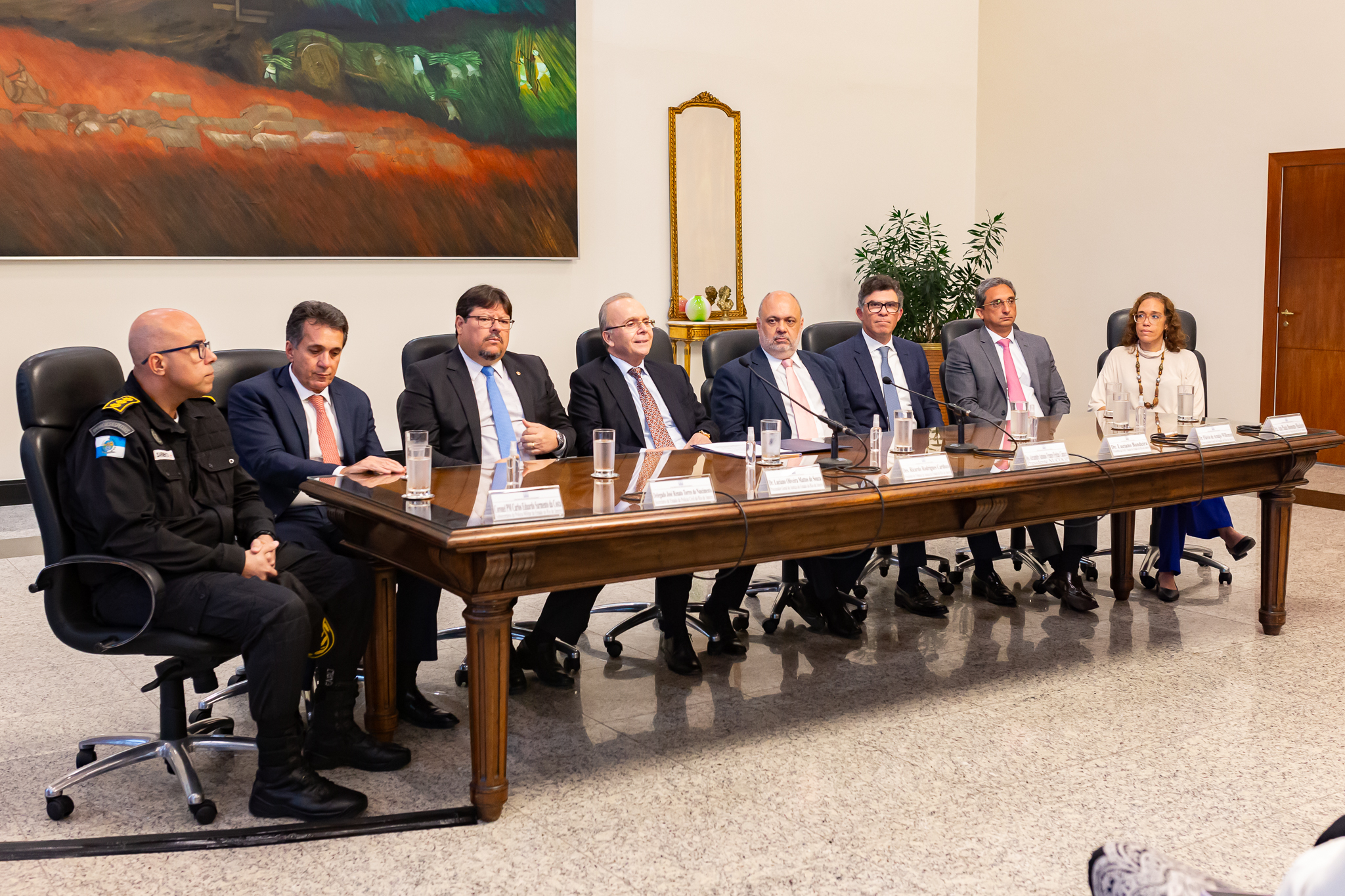 Da esquerda para direita: coronel PM Luiz Henrique Marinho Pires, secretário de Estado da Polícia Militar; delegado José Renato Torres do Nascimento, secretário de Estado da Polícia Civil; Luciano Oliveira Mattos de Souza, procurador-geral de Justiça do Estado; desembargador Ricardo Rodrigues Cardozo, presidente do TJRJ; desembargador Alexandre Antônio Franco Freitas Câmara, presidente do NUCOOP; Luciano Bandeira, presidente da OAB-RJ; Flávio de Araújo Willeman, subprocurador do Estado; Ana Paula Buonomo Machado, subprocuradora-geral do Município do Rio de Janeiro.