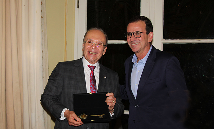 O presidente do TJRJ, desembargador Ricardo Rodrigues Cardozo, foi homenageado, na noite de segunda-feira (3/2), pelo prefeito Eduardo Paes, que entregou ao magistrado a chave da Cidade do Rio de Janeiro, em jantar que reuniu familiares do presidente, integrantes de sua gestão, amigos, políticos e autoridades de diferentes Poderes, na sede da prefeitura, em Botafogo.