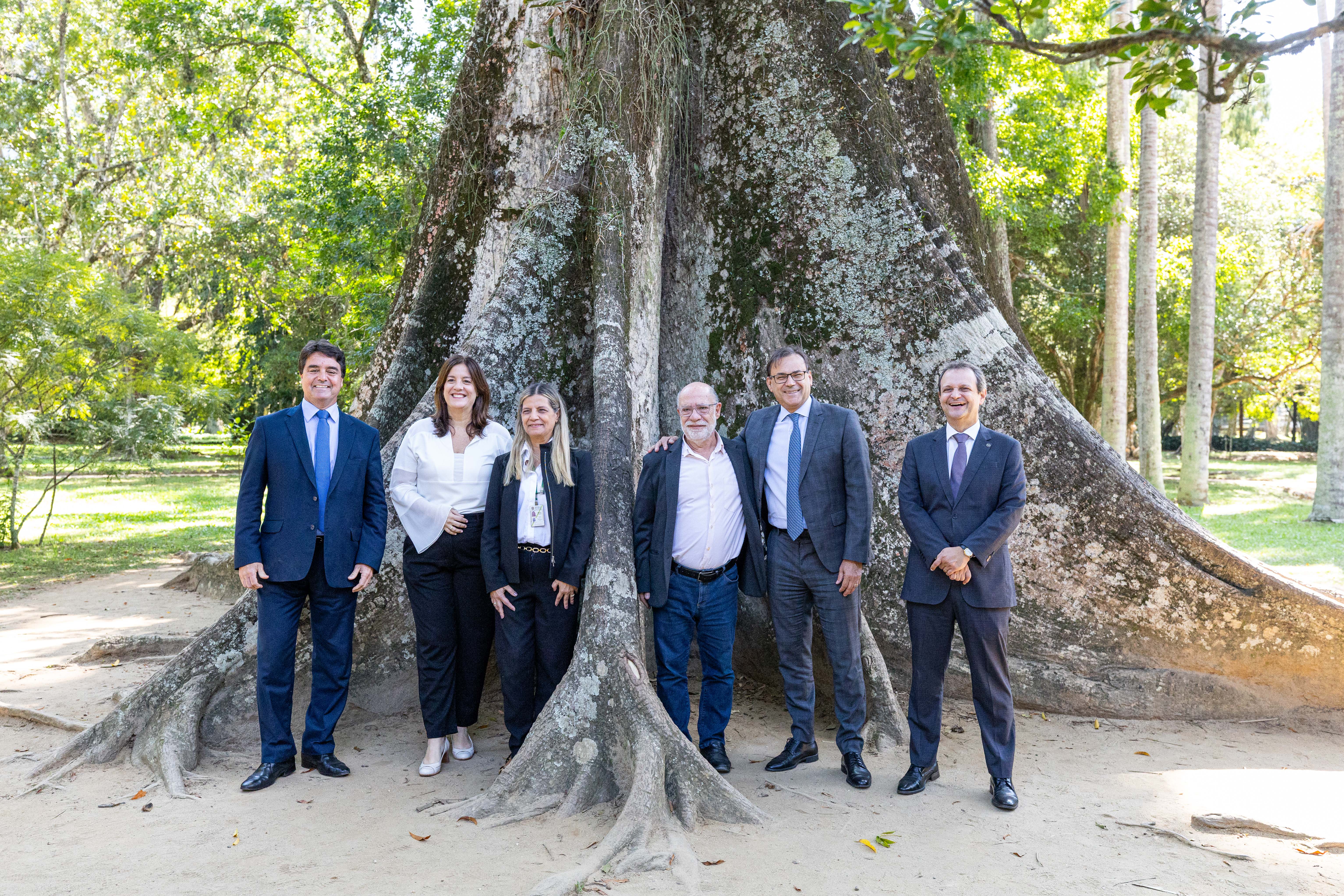 Da esquerda para a direita: o Secretário-Geral de Sustentabilidade e Responsabilidade Social, Carlos Eduardo Menezes da Costa; a juíza-auxiliar da presidência, Paula Feteira Soares; a diretora de conhecimento, ambiente e tecnologia do Jardim Botânico, Marcia Aparecida Lobianco Faraco de Andrade Alves; o presidente do Jardim Botânico do Rio de Janeiro, Sérgio Besserman; o presidente da Comissão de Políticas Institucionais para Promoção da Sustentabilidade (COSUS) do Tribunal de Justiça do Estado do Rio de Janeiro (TJRJ), desembargador Elton Martinez Carvalho Leme; e o procurador federal, Alexandre Coelho Neto; durante visitação no Jardim Botânico