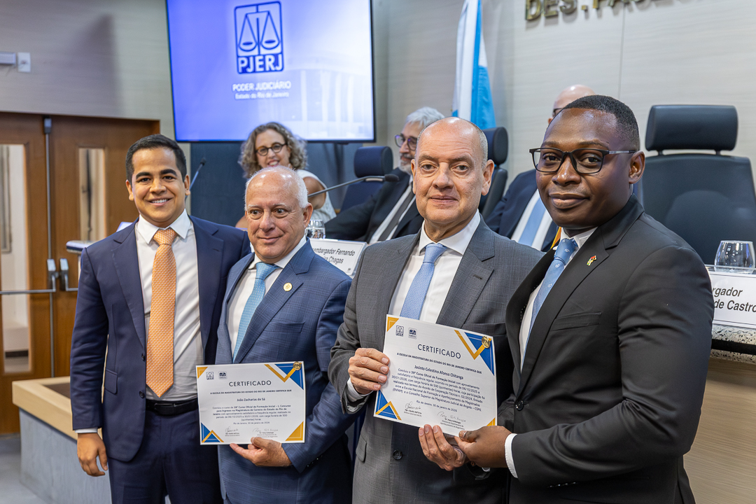 O presidente do TJRJ e o diretor-geral da Emerj entregaram, ao final da cerimônia, os certificados aos novos formandos e, em nome de todos, receberam os diplomas de conclusão o primeiro colocado no L Concurso da Magistratura de Carreira, João Zacharias de Sá e ao angolano Jacinto Celestino Afonso Chitanga.